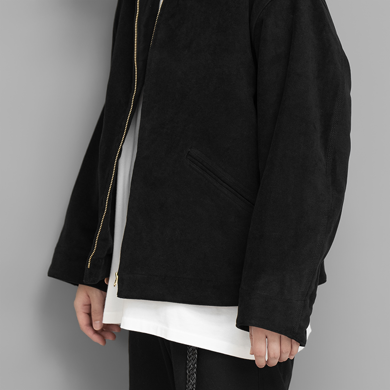 型は、ワークジャケットのような雰囲気にデザインされたジップジャケットです。肩や身頃は広めにとって、着丈は短めにしています。袖や脇の部分は、タフなトリプルステッチを採用し、中はコットンネルの総裏で、内ポケットを2つ付けています。