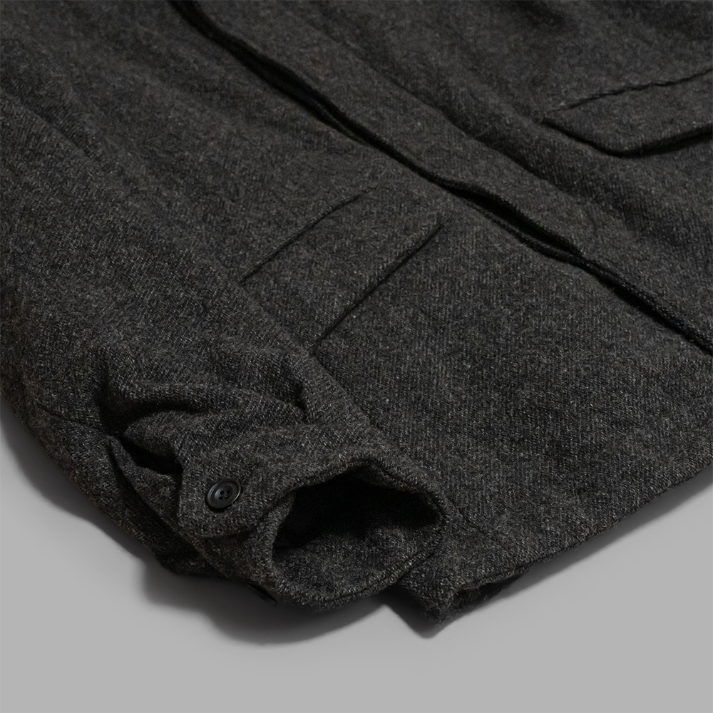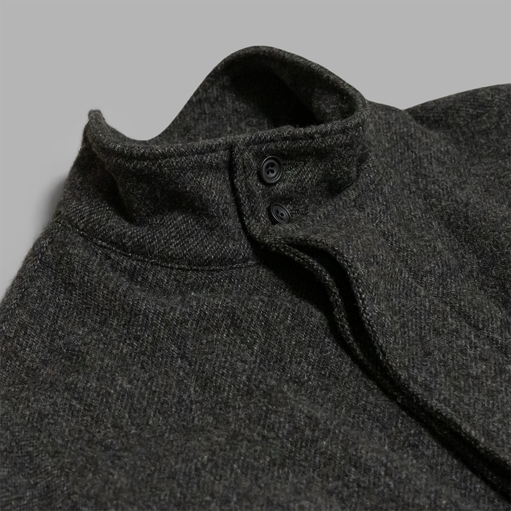 グレー/ブラウン/ブラック/カーキの風合いの良い多色の糸を組み合わせることで、複雑で深みのある色感を表現したウールツイード素材を使用しています。とても柔らかなタッチと軽く膨らみのある質感も特徴的な生地です。