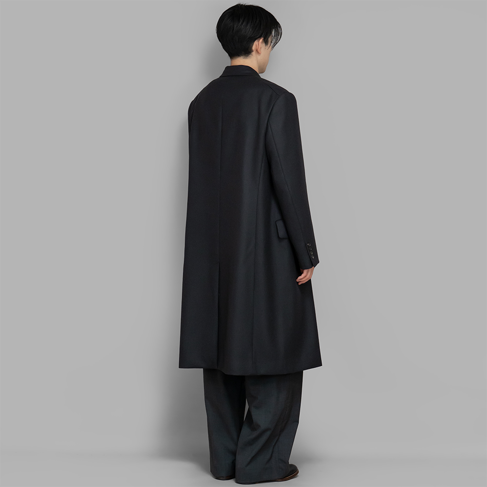 デザインは、適度なゆとりをもたせたシルエットのダブルチェスターコートです。襟はダブルの前立てと相性がいい下襟の剣先が上に向くピークドラペルで作られています。肩周りから前身頃にかけて芯地が入っており、着用した際のシルエットを綺麗に保ってくれます。袖口は、ボタンの留め外しが出来ない飾りボタンの仕様です。内側は滑らかなキュプラの生地を使用し、総裏で仕立て、内ポケットが2つ付きます。