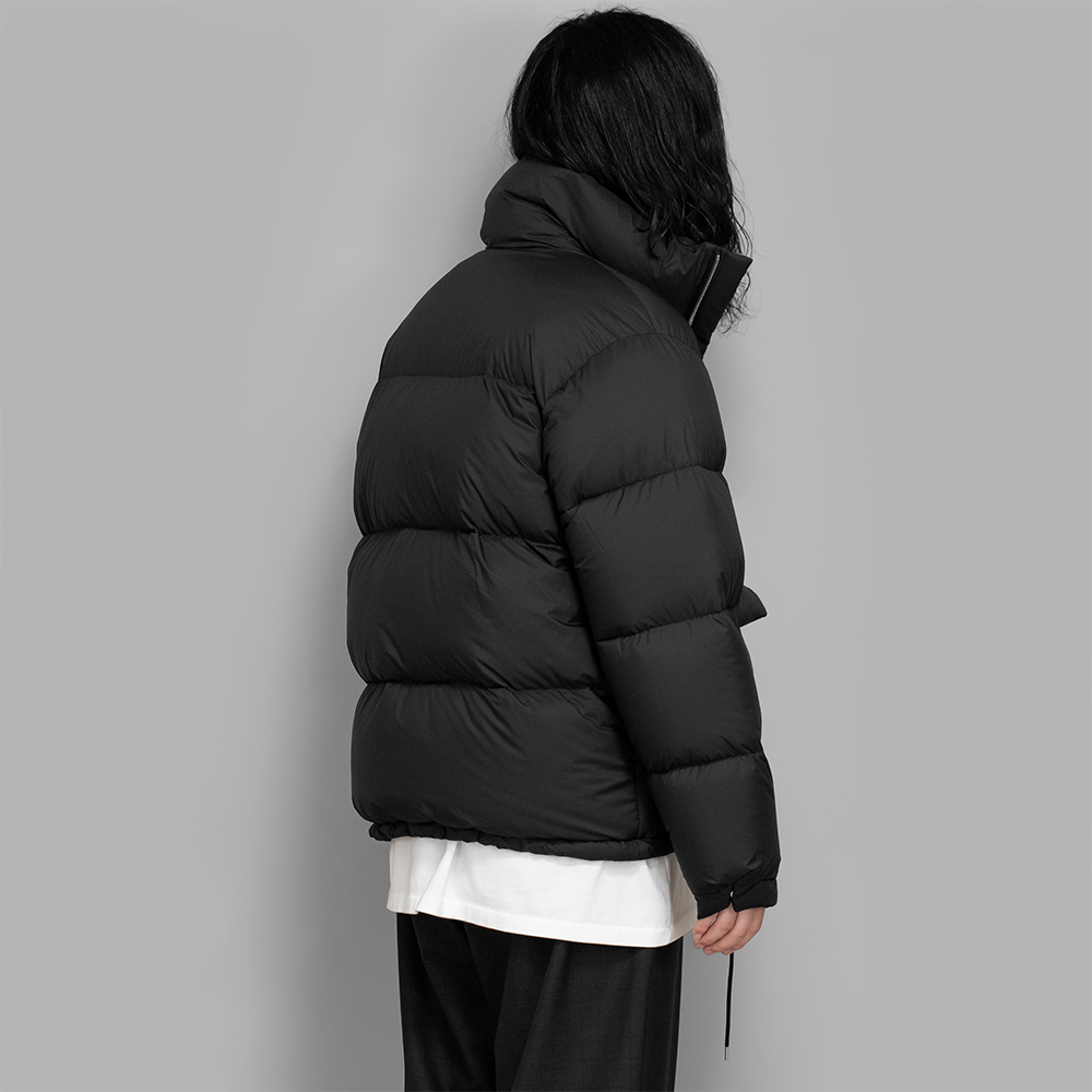 型はボックスシルエットで、身幅を広めにとっています。ポケットは二重構造で、フラップ部分とサイドで2種類のポケットが付きます。フロントのパーツには艶消しシルバーのririジップを採用。裾にはドローコードが通ります。