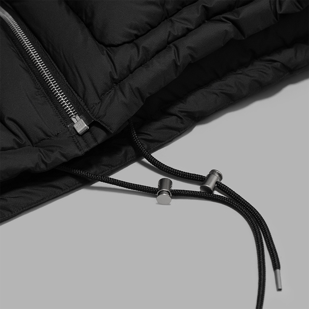 表の生地は15dの極細ナイロンウーリー糸を使用した超軽量ミニリップストップです。裏面に特殊なウレタンコーティングを施し、防風性と撥水性を兼ね備えた機能性にも優れています。中わたにはフランス産のホワイトダックダウンを使用し、加工を加えることで、より軽くふっくらとした質感を実現しています。