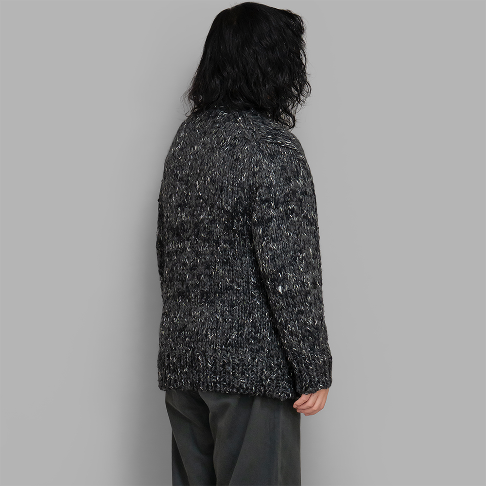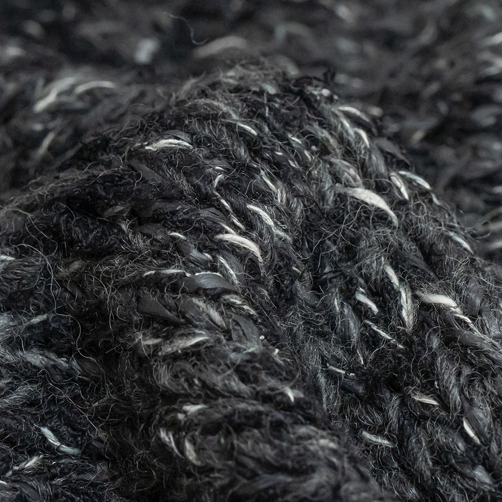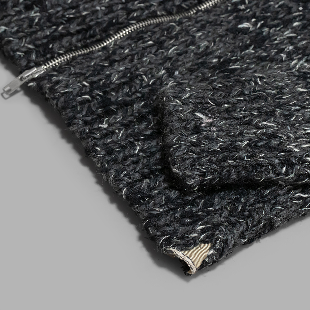 インド手紡ぎシルクや、ウール、和紙、コットンといった素材や太さが異なる糸を、1つ1つ手作業で編み立てたハンドニット素材を使用しています。今回のオーダーはブラックミックス白少なめ、ブラックやグレーの隙間から除く白が、奥行きのある表情にに仕上がっています。しっかりとした肉感と、柔らかく優しいタッチな質感は冬のアウターとして活用できます。