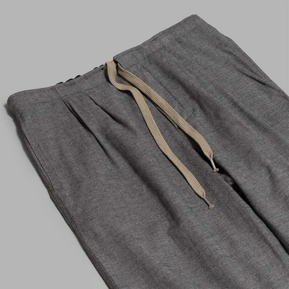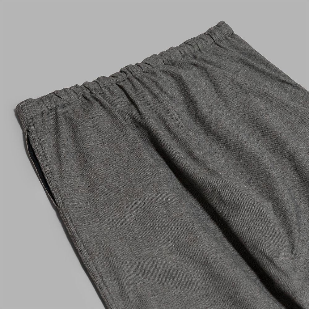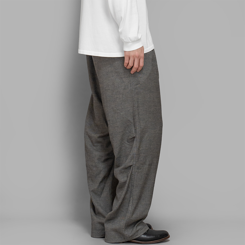 型はゆったりとしたストレートシルエットのイージーパンツで、ミニマルなデザインでありながら、本来フロントに施されるニータックを背面に施し、シルエットに変化を与えています。内側はキュプラ素材の裏地が膝下まで付きます。