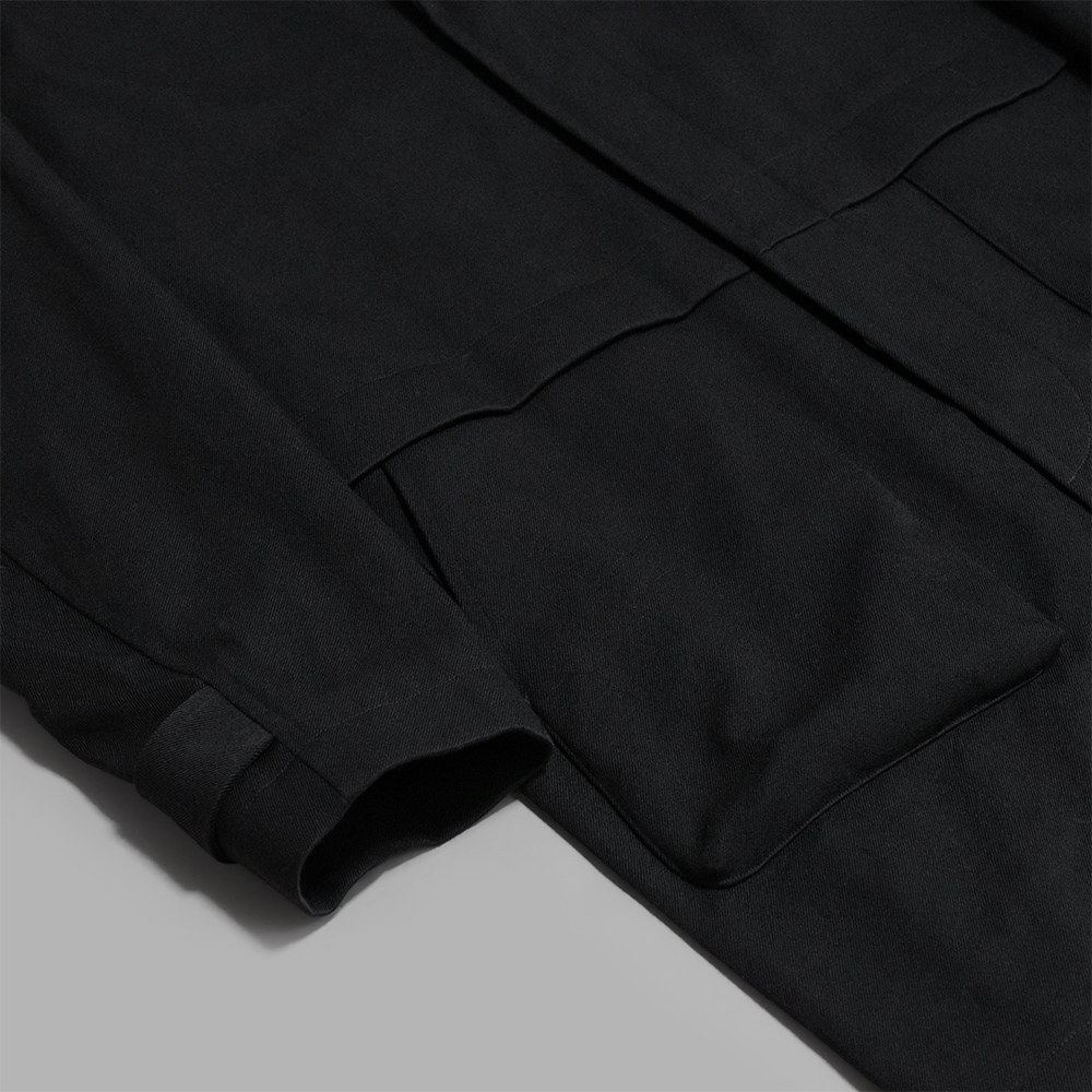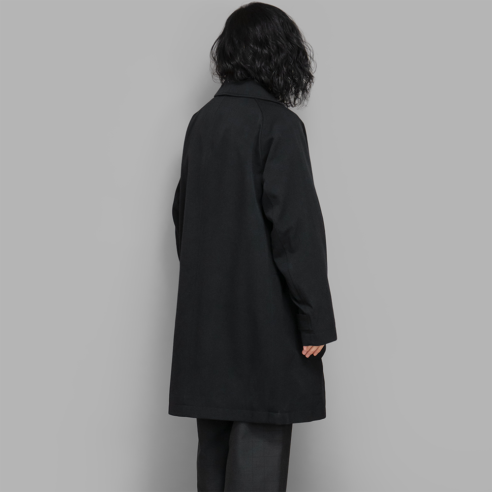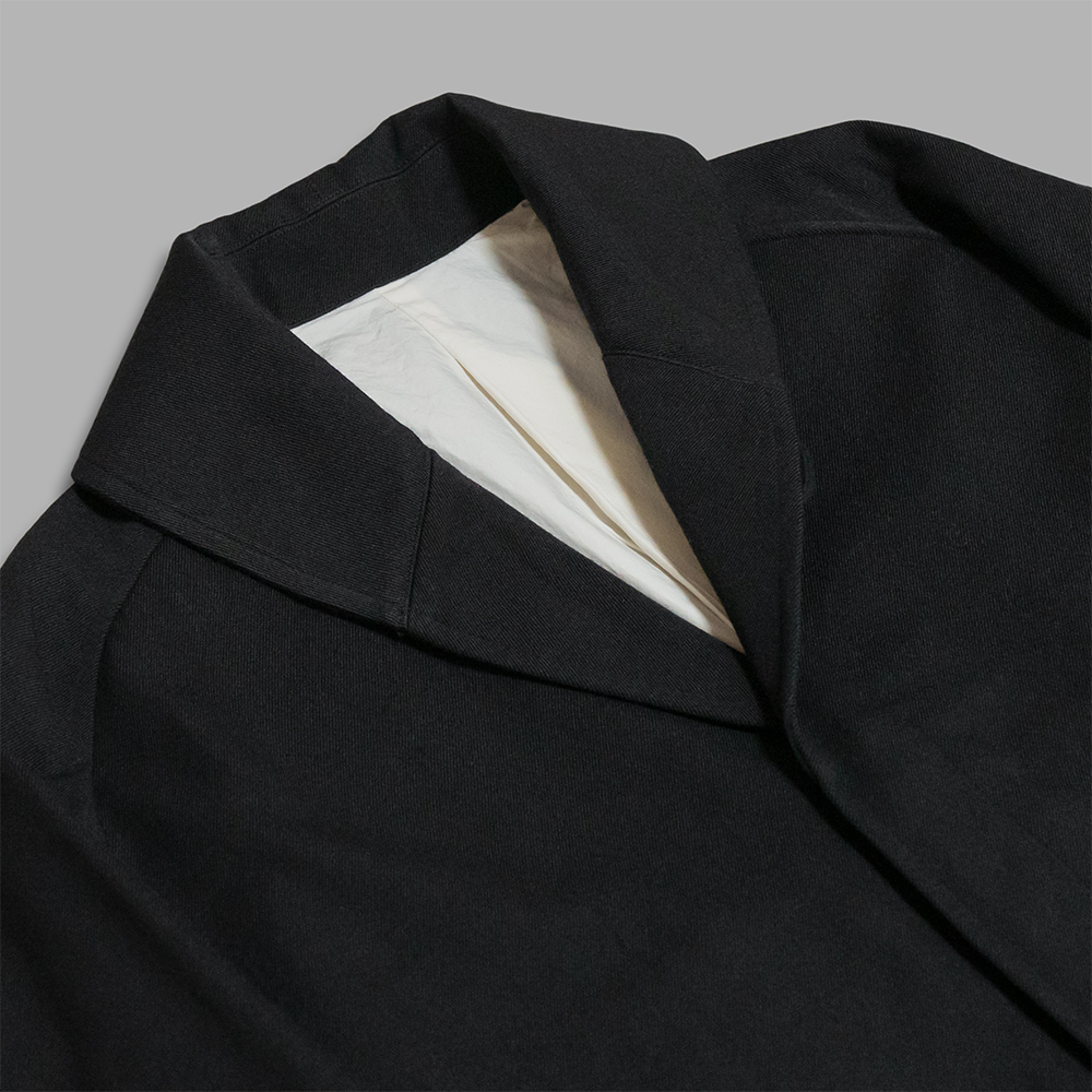 型は広めの身幅でゆとりあるシルエットにデザインしたショールカラーコートです。ラグランスリーブの袖は前方に振ったパターンにより腕周りの可動域を確保し、インナーを着込んでも着心地の良い設計にしています。内側はさらっとした質感のオーガニックコットンの総裏で仕立て、ポケットは1つ付きます。