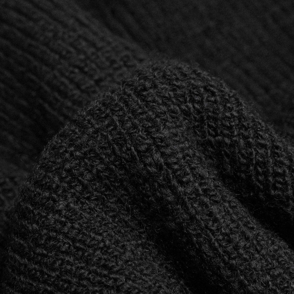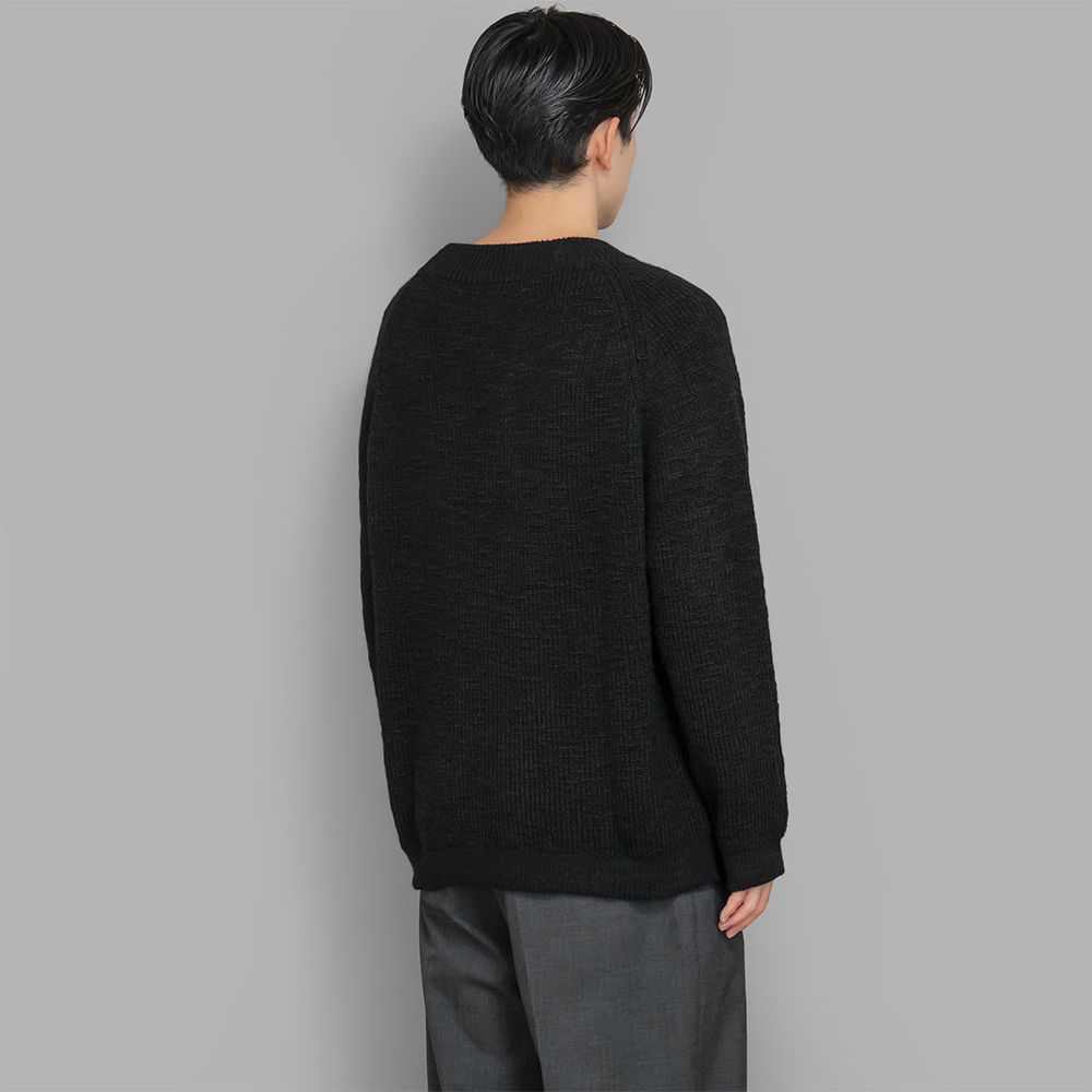 南米ウルグアイ産のノンミュールジングウールを太番手のスラブ糸に紡ぎ、畦編みで編み上げたニット素材を使用しています。膨らみのあるスラブ糸により、ざっくりとした表情ながら軽やかなボリュームを実現しています。