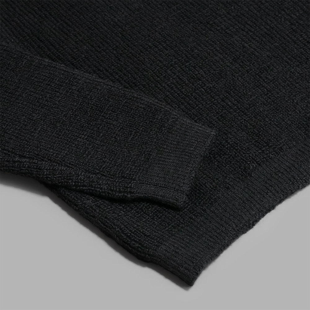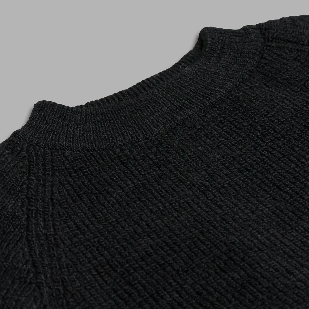 型はシンプルなクルーネックのデザインで、畦編み特有の立体的なボリュームを活かした、身幅にゆとりをもたせたシルエットです。インナーとしてはもちろん、アウターとして中にシャツを着用しても窮屈さを感じさせず、秋冬の着こなしに柔軟に対応します。