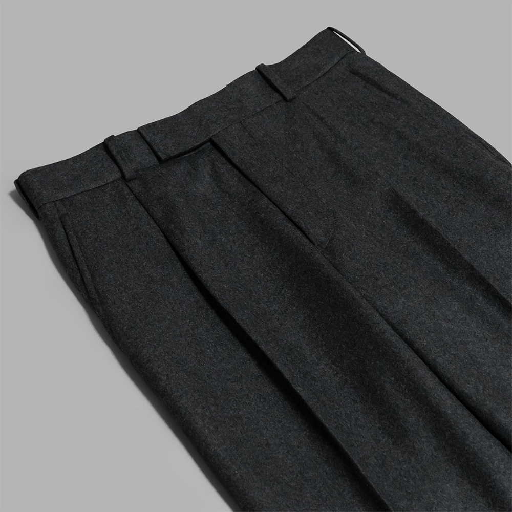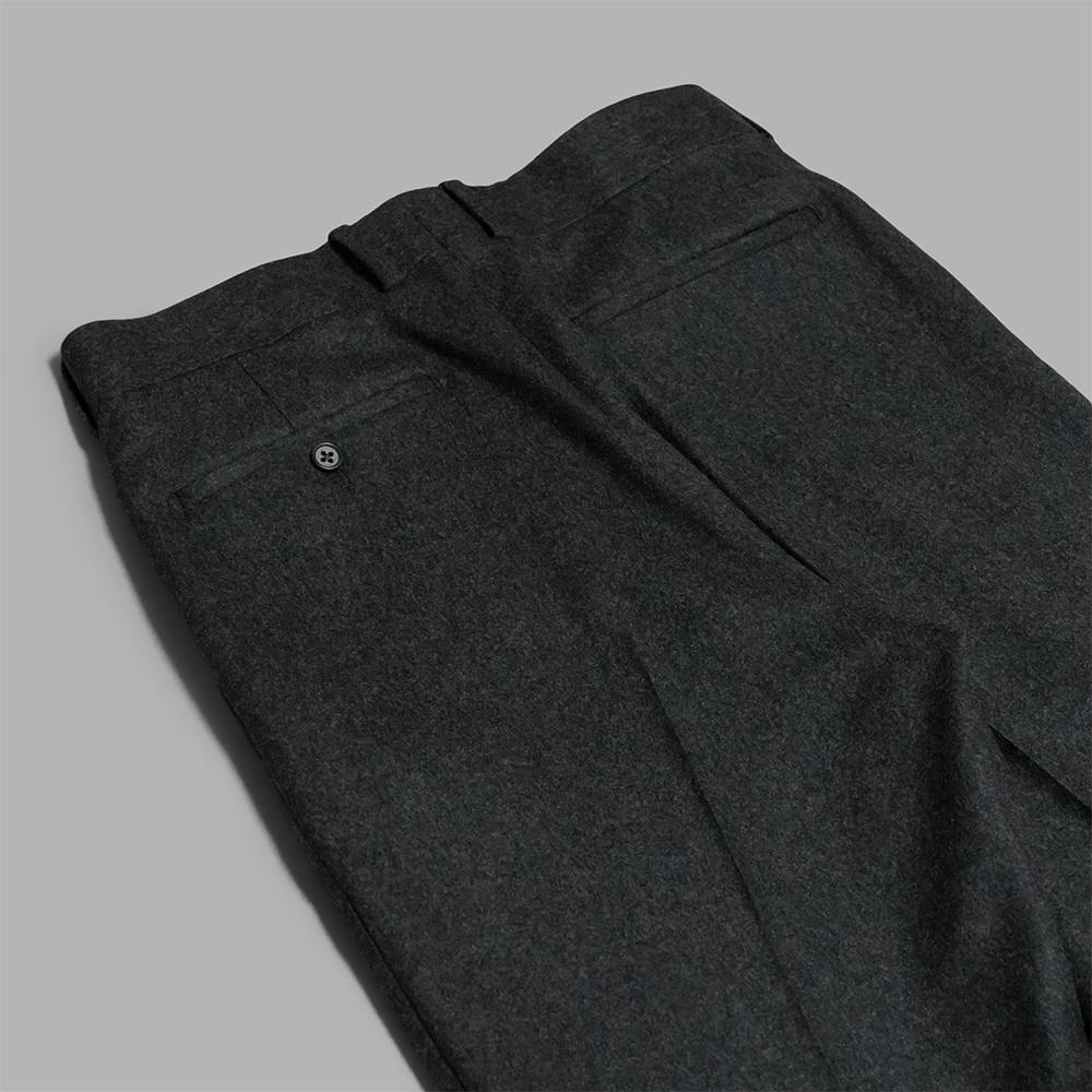 型は、適度にゆとりがありながらも、スッキリと綺麗なラインで着用することができる絶妙なサイズバランスで製作された、微かにテーパードのかかったワンタックのスラックスです。裾が綺麗に落ちることも特徴で、レザーシューズは勿論のこと、スニーカーでもあわせやすい形になっています。前立てはジップフライで、中は半裏の仕様です。