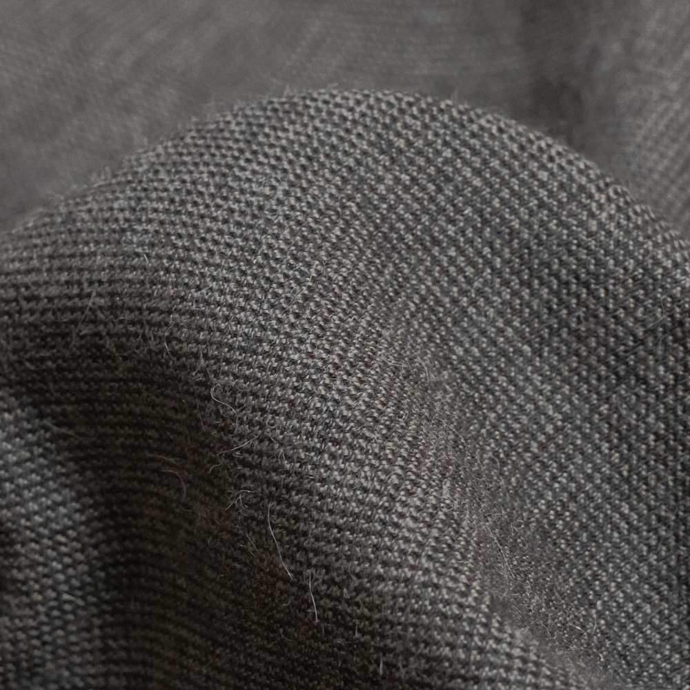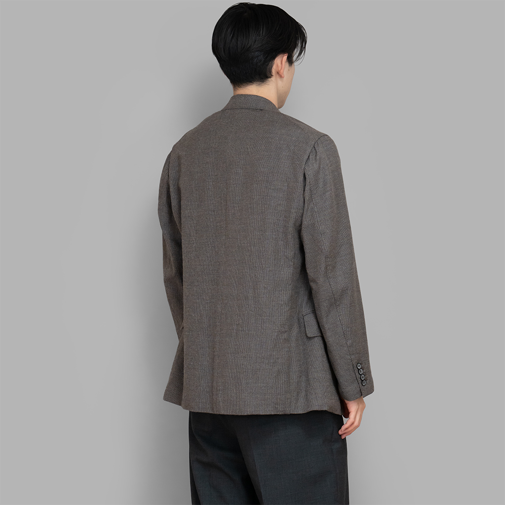 素材は、アルパカ、ウール、シルクを使用しています。滑らかな肌触りの生地に、製品洗いを程こすことで、膨らみやナチュラルなシワ感が加えられていることが特徴です。多色の糸を使用したピンチェック柄ですが、近しい色調で製作することで、全体的に色の馴染みが良く、ファッション感度の高いアイテムとして仕上げつつ、クラシカルで落ち着いた印象で着こなすことができます。