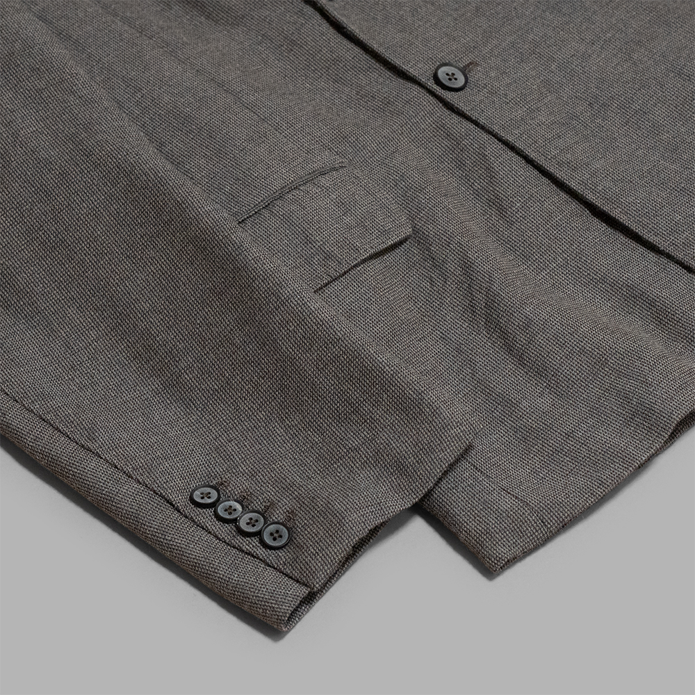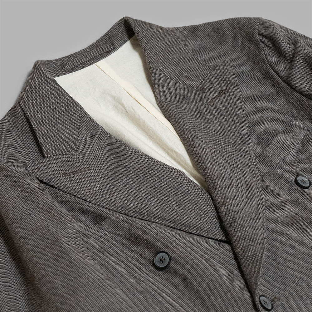 型は、適度にゆとりがあるアンコンタイプのジャケットです。襟のAMFステッチやフラワーホール、襟裏のヒゲ仕様などの正統派テーラードジャケットをベースに製作されています。EMジャケットと同様で、肩周りはジャケットらしくカチッとさせ、袖は裏地が無いことで、ストンと綺麗に落ちるようにしています。裏地は、袖以外総裏の仕様で、内ポケットが左右に一つずつ付きます。