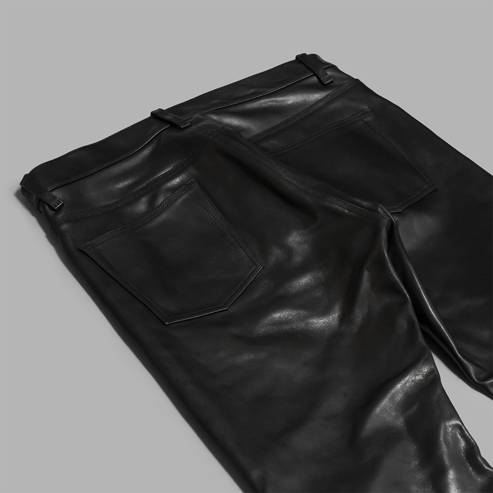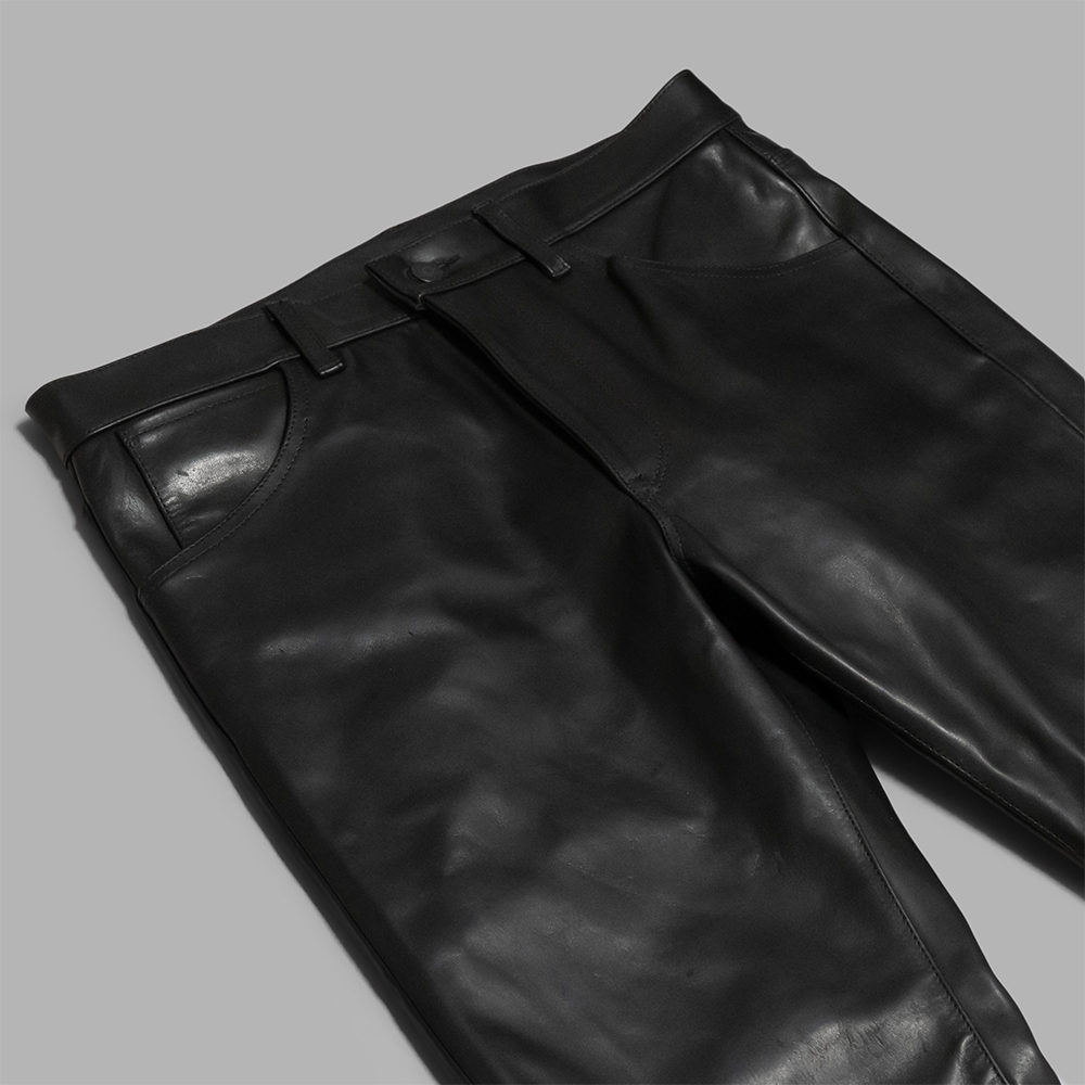 しっかりした質感のホースレザーを使用しています。型は、細身のシルエットの5Pパンツで、前立てはジップフライ、中は半裏の仕様で作られています。
