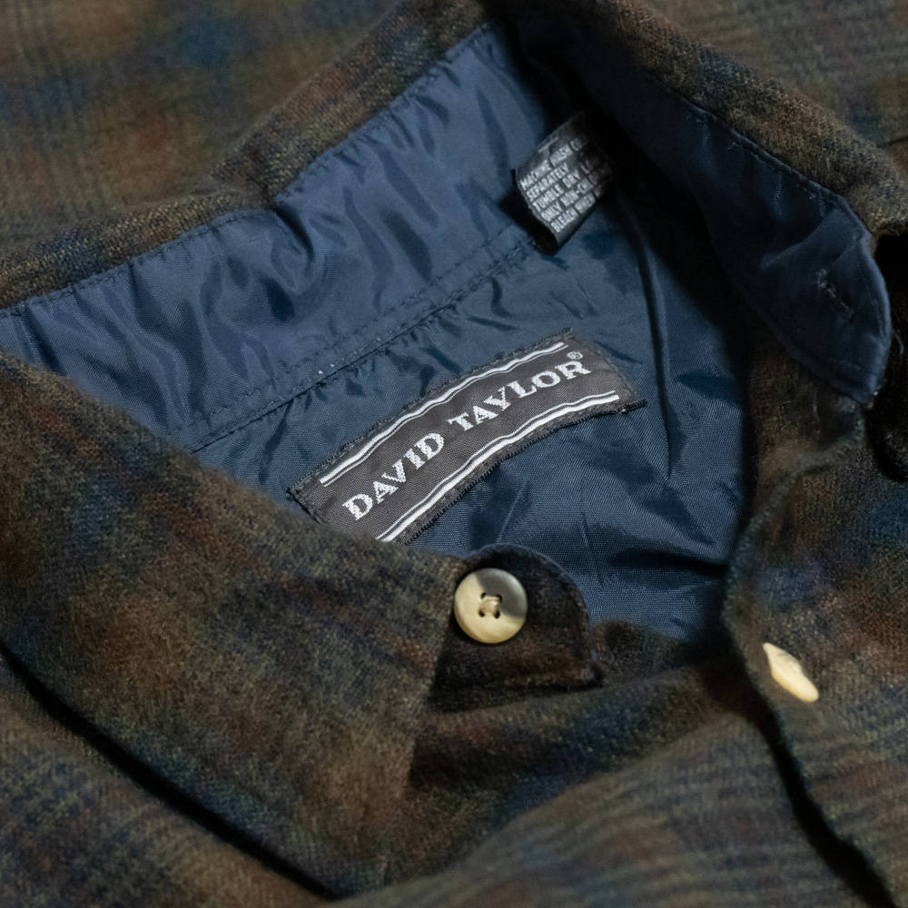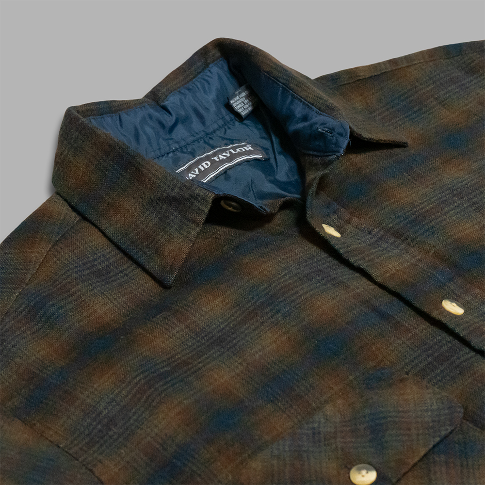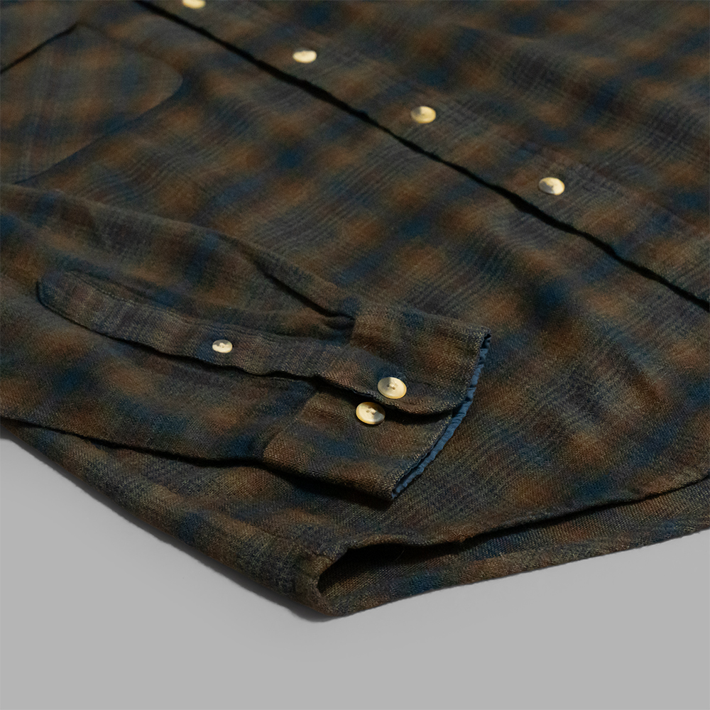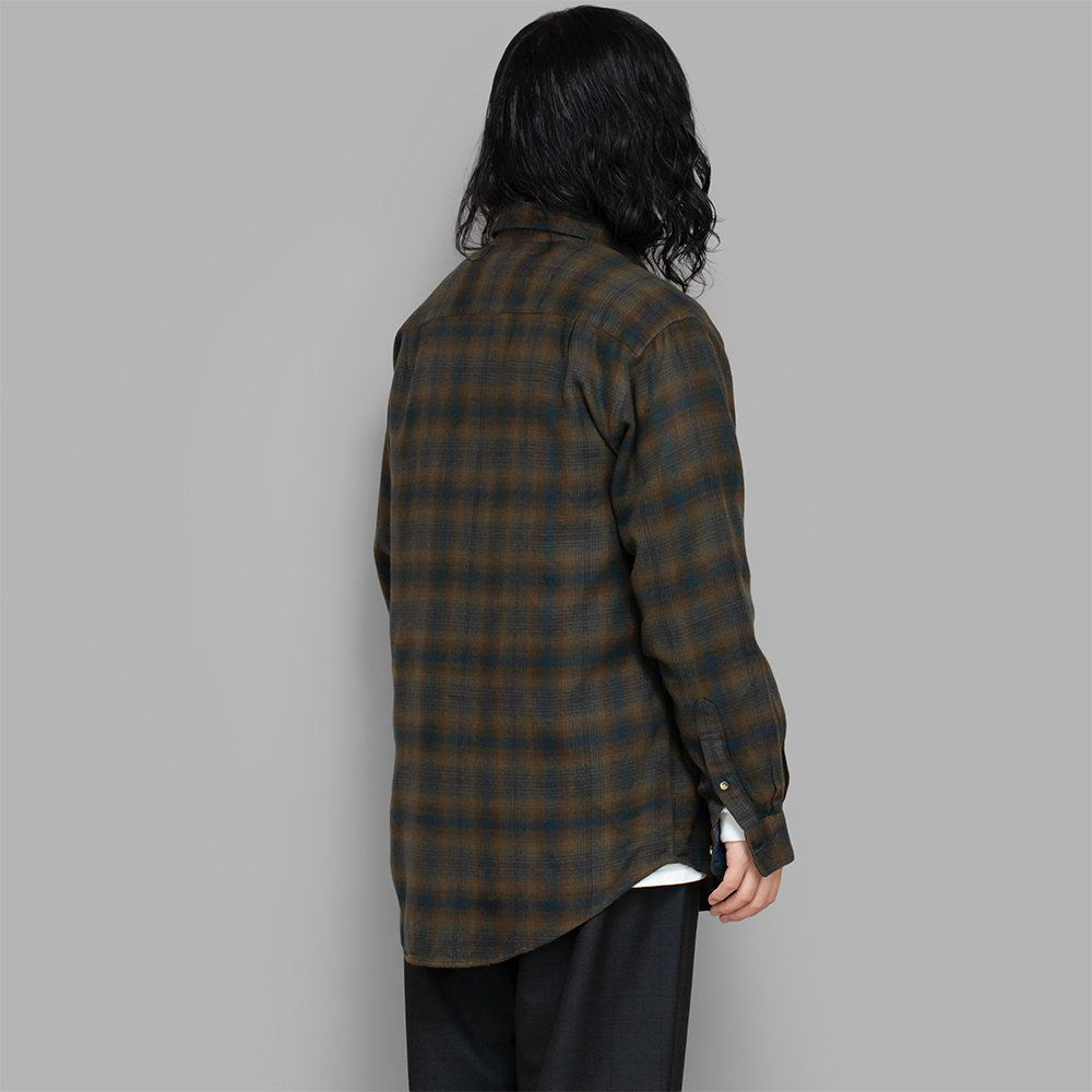 型は身頃とアームホールを広く取りながら、着丈をややスッキリとさせたサイズバランスなのも特徴です。ダブルフラップポケットが付く仕様で、ヴィンテージのウールシャツに採用されることの多い、襟裏とカフス裏に裏地が付く仕様が採用されています。