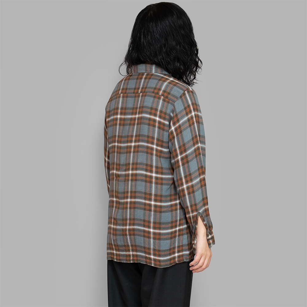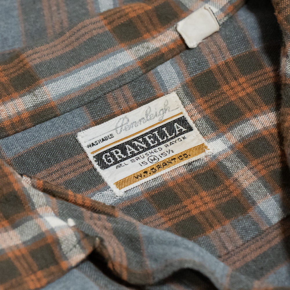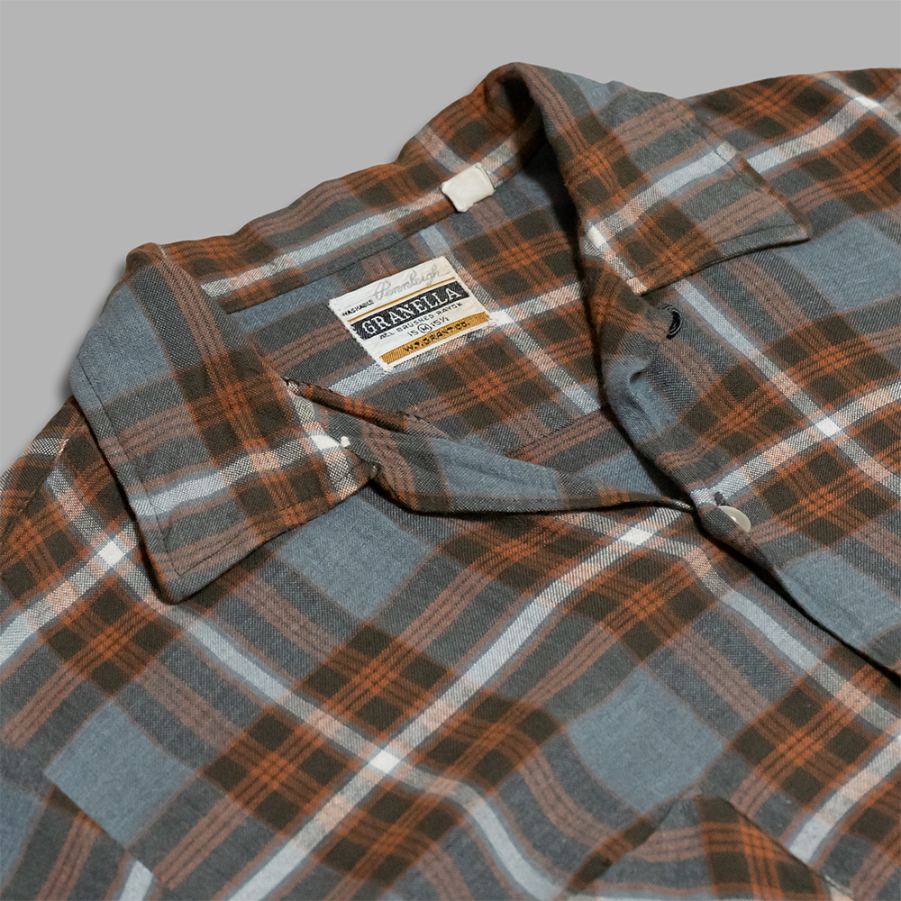 1960年代頃に仕立てられたもので、グレーとオレンジをベースにしたレーヨンのチェック素材が使用されています。奥行きのある、落ち着いた配色のチェックと、とろみのある生地が合わさり、雰囲気の良い1着となっています。