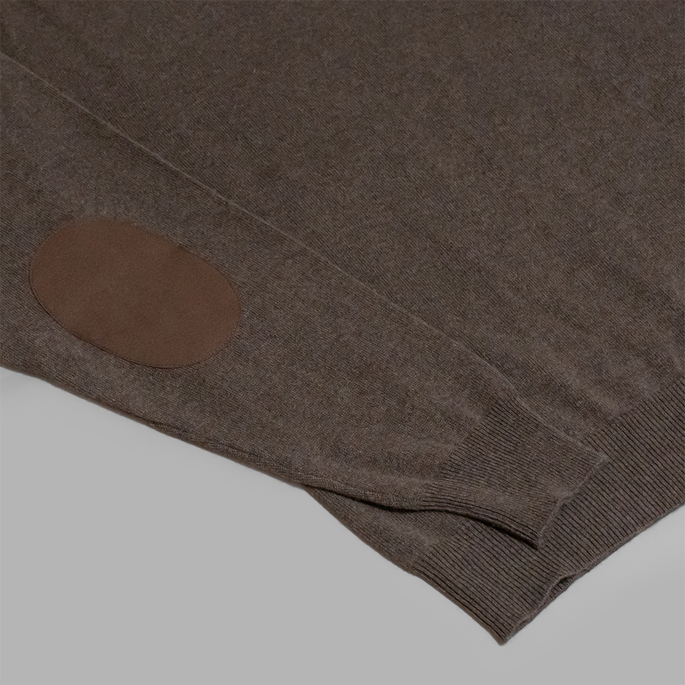 型はシンプルなクルーネックのデザインで、適度にゆとりを持たせたサイズバランスです。カラーにはヨーロッパらしいPeat(泥炭)と名付けられたチャコールブラウンのような深みのある物をセレクトしています。エルボーパッチには柔らかさと質感を楽しめる、鹿革を配しています。