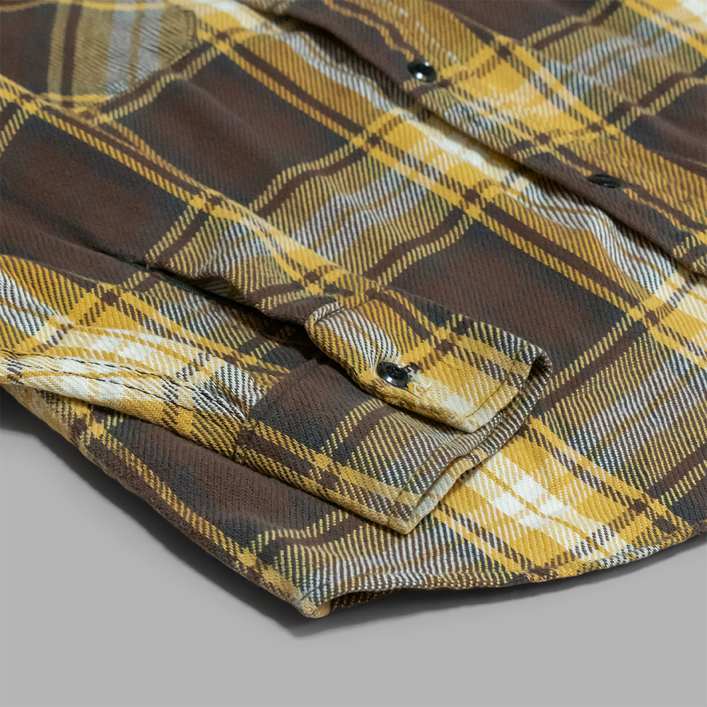 型にはフラップポケットがつく仕様に、身幅はややゆとりを持たせ、バランスの良い丈感、シルエットになります。着丈も、大きめが多い古着のシャツの中では、短めのものになり、あわせやすい印象です。