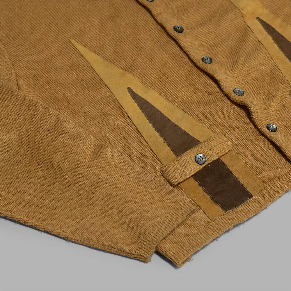 1970年代頃にアメリカで仕立てられた1着です。同ブランドはデザイン性の優れたニットアイテムを数多く展開しており、同アイテムはレザーとニットを掛け合わせた個体となります。マスタードの色味と使用された2色のレザーの配色は暖かい雰囲気を醸し出してくれます。