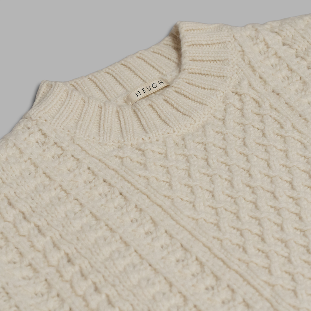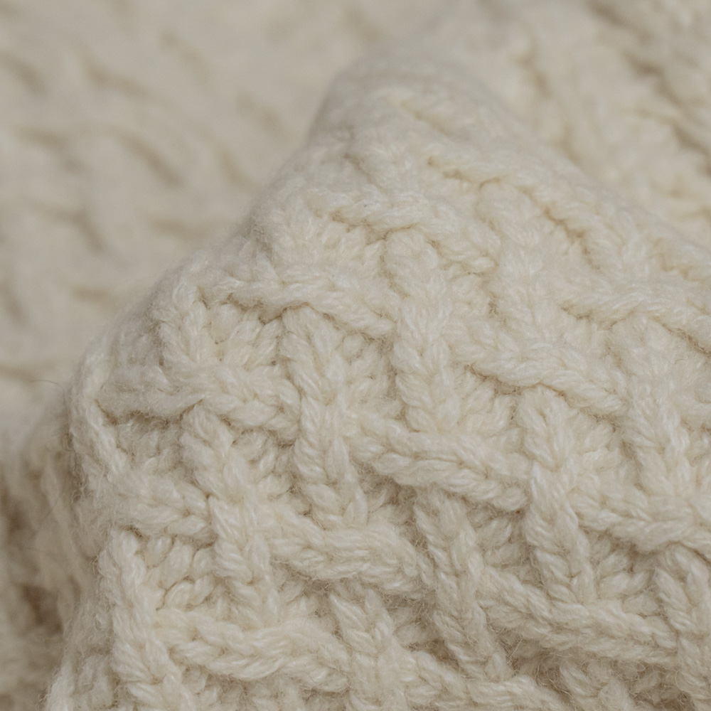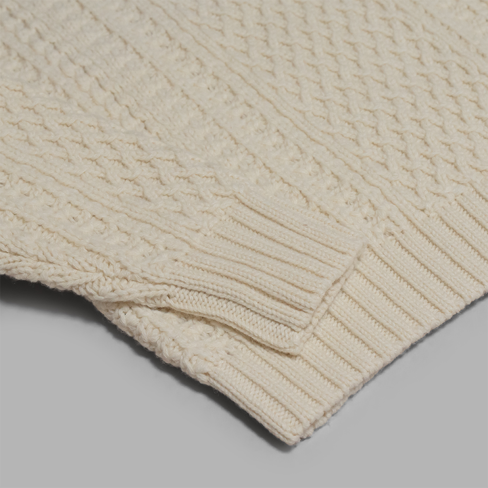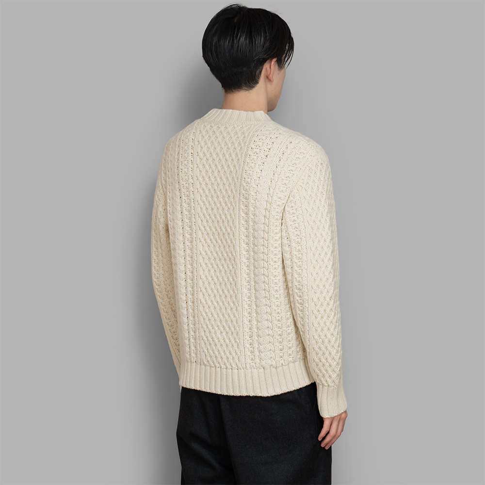 シェットランド風の太番手でありながら、弾力性に富み、柔らかな着心地の良さを持ち合わせた上質なイタリアのウール糸を使用しています。編み柄はアランニット特有な縄をモチーフにした様々な柄を組み合わせた、力強いデザインです。