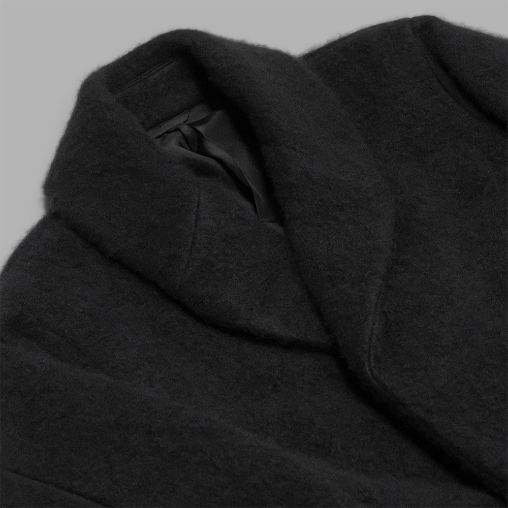 型は、ショールカラーのハーフコートです。前はボタンレスのデザインですが、フロントとサイドに紐が付けられており、前を留めて着用することも可能です。中はシルクの総裏で仕立て、内ポケットを2つ付けています。