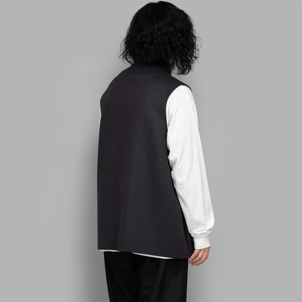 型は前立てジップ開きのベストで、サイズ感はゆったりめに作られています。フロントの大きなポケットが特徴です。裏地、内ポケットはありません。