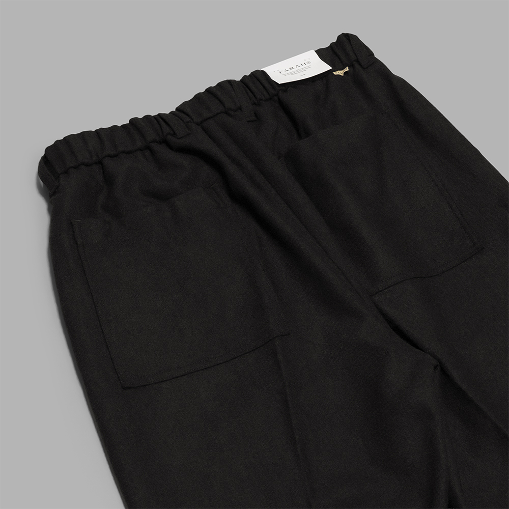 型はワイドテーパードシルエットのイージーパンツです。腰回りはドローコードとゴムを通した仕様で作られており、ベルトレスでの着用もできますが、ベルトループも付いていますので、ベルトを通して着用することも可能です。前立てはジップフライ、裏地は半裏の仕様で仕立てています。