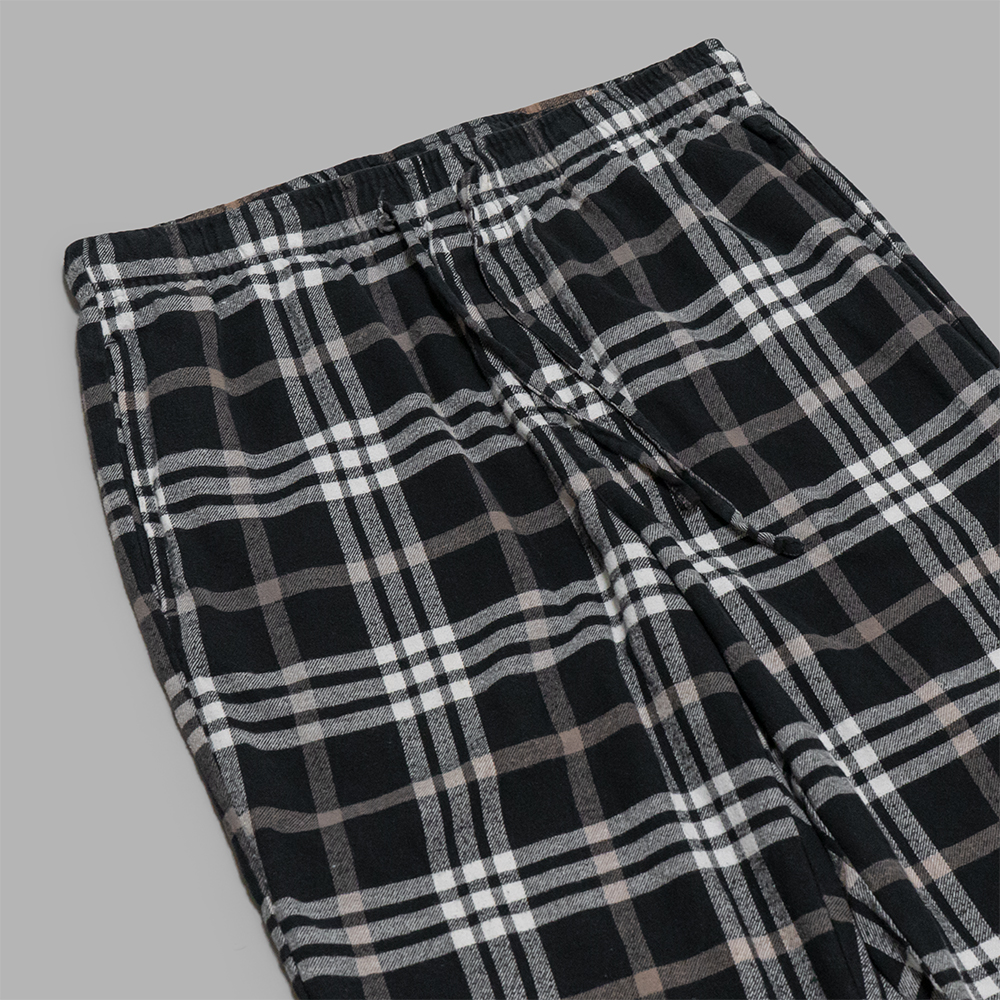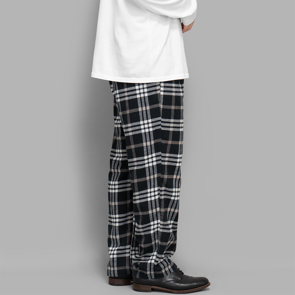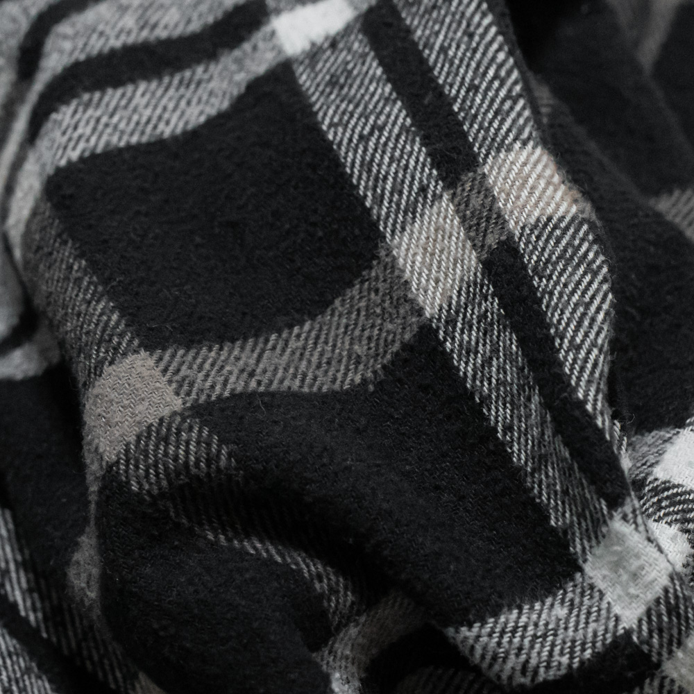 柔らかさがあり、肌馴染みの良いコットンをベースとしたフランネル素材で生産されています。黒と白をベースにシンプルな配色でありながら落ち着いた印象を与えてくれます。生地の厚みも程よく、真夏を除いた3シーズン着用できるのもポイントです。