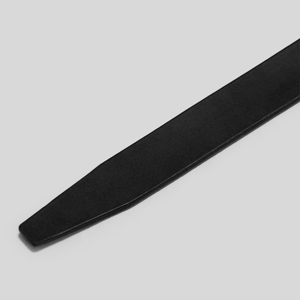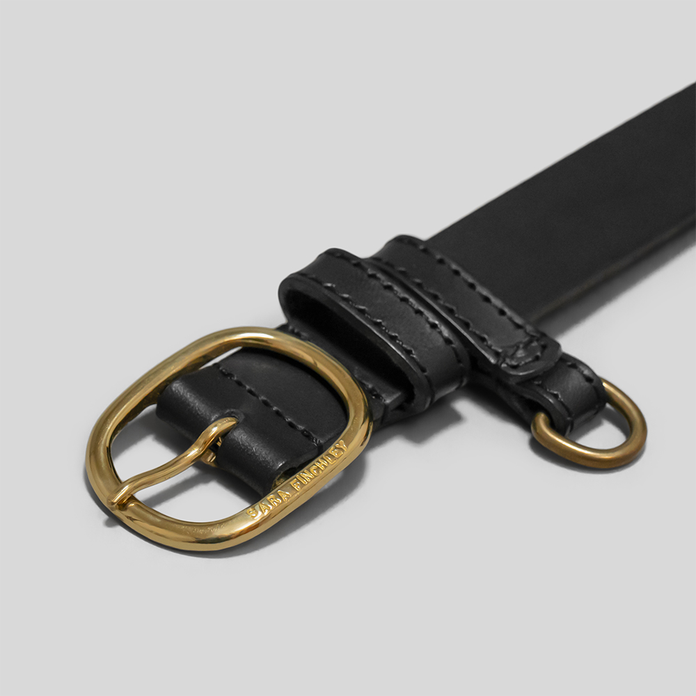 あまり重々しい雰囲気にはならないよう、丸みをもたせたバックルや緩やかに細くなる剣先、そして、コバも軽めの磨きで仕上げた新作のレザーベルトです。