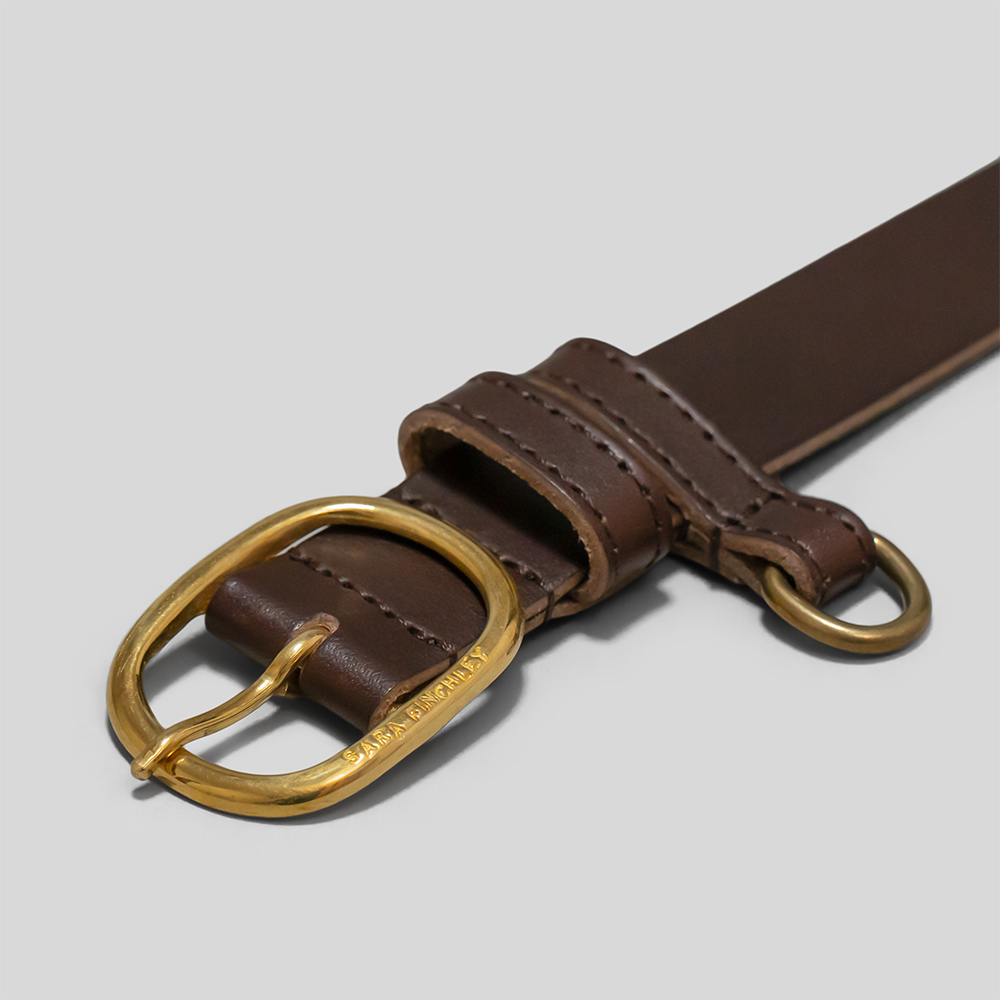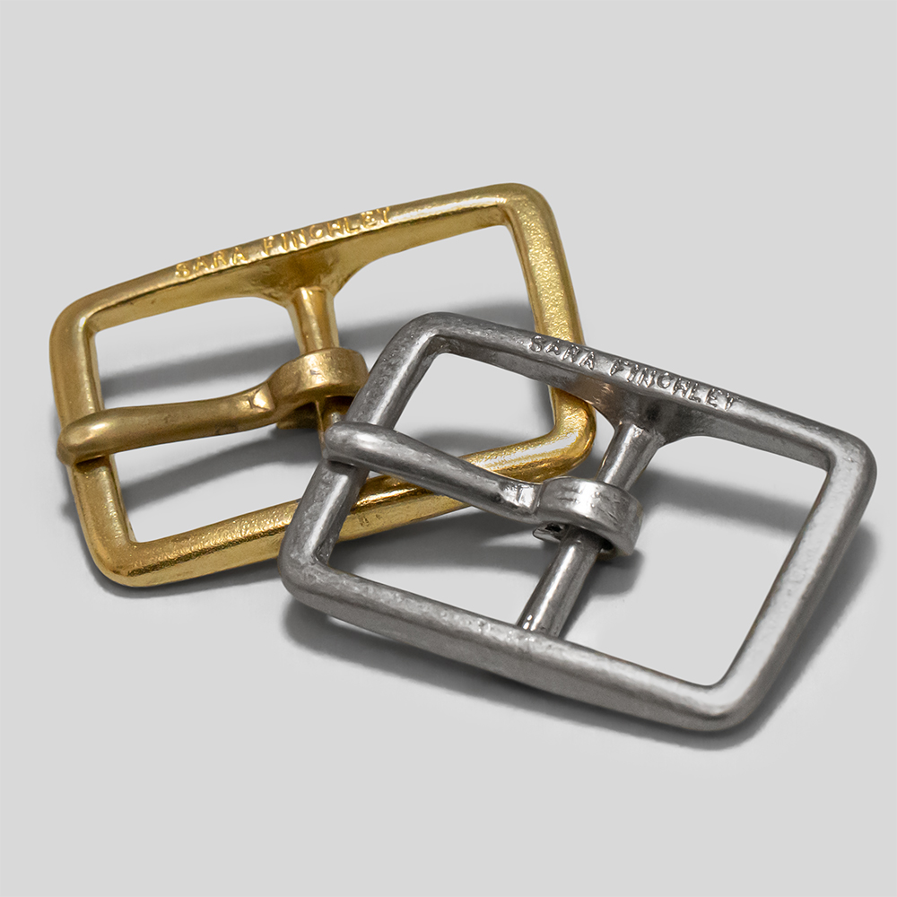 素材は、落ち着いた艶感のある国産の厚口ステアハイドに真鍮のバックルを組み合わせています。真鍮バックルは、下記にあります3つの仕上げから、ご選択いただきます。合わせる衣服やお客様のお好みをもとにお選びください。