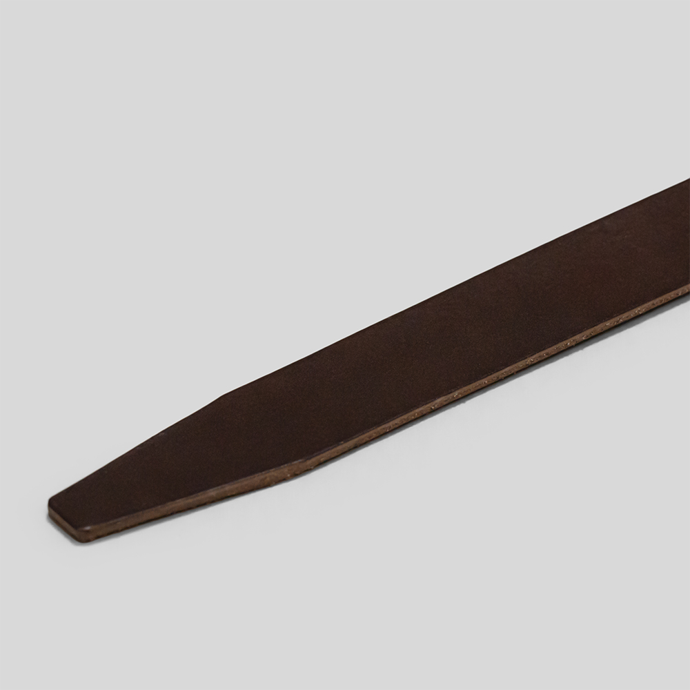 あまり重々しい雰囲気にはならないよう、丸みをもたせたバックルや緩やかに細くなる剣先、そして、コバも軽めの磨きで仕上げた新作のレザーベルトです。