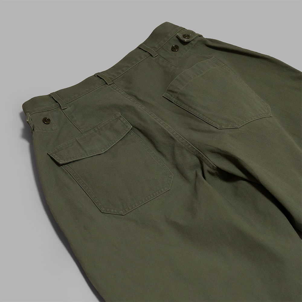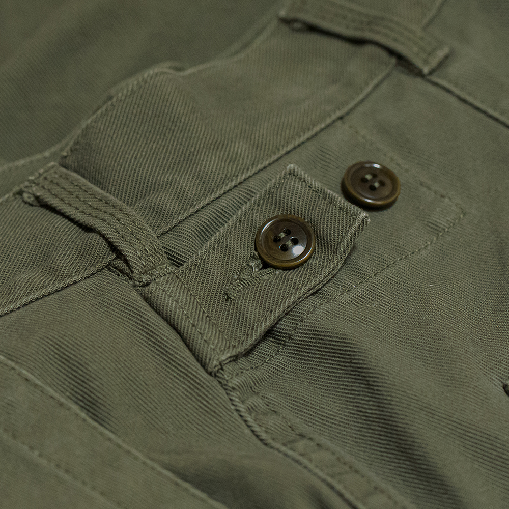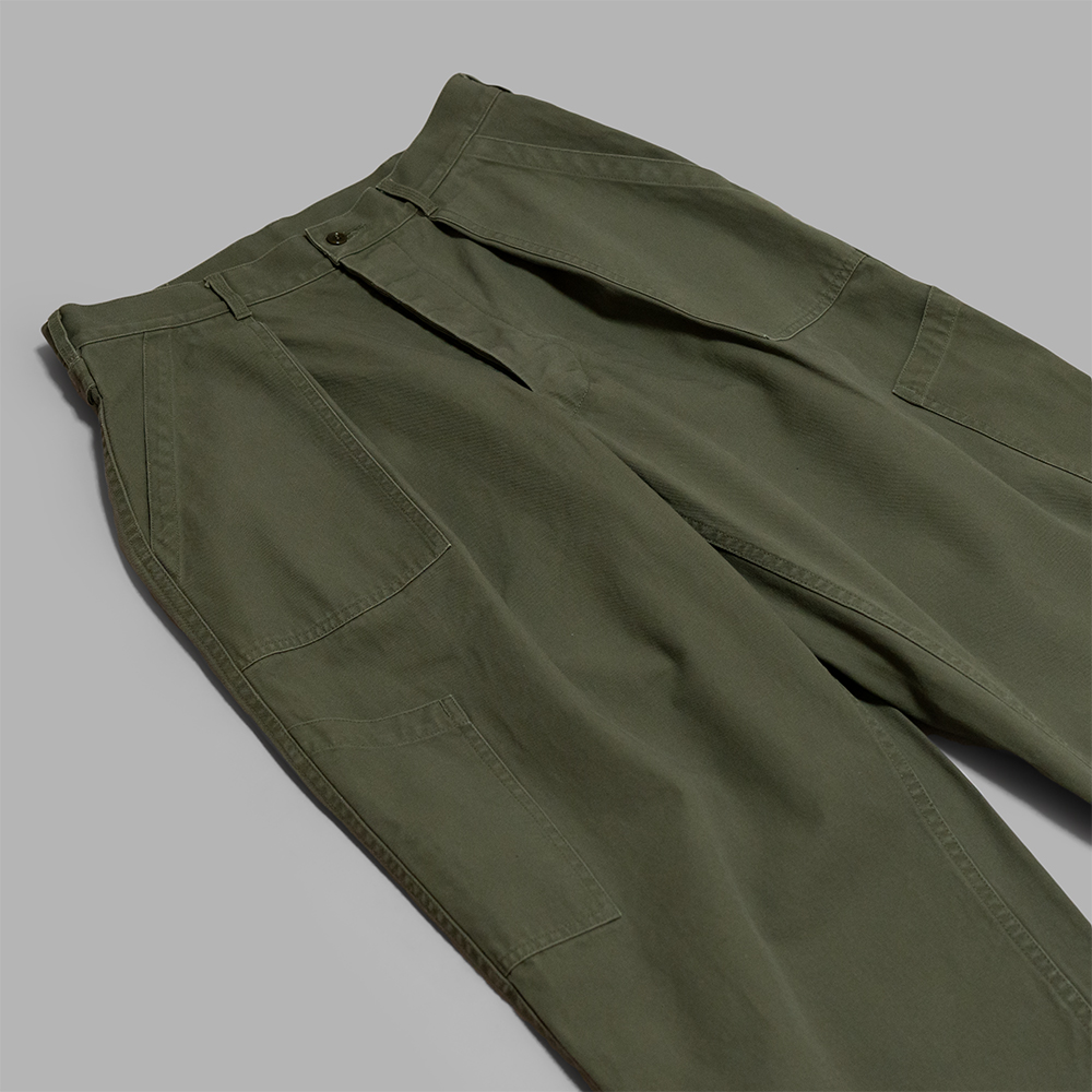 型は、U.S.ミリタリーの定番ベイカーパンツに比べてポケット数が多く、ワークパンツ仕様のデザインが特徴的なU.S. ミリタリーのメカニックパンツがベースになっています。バランス良く配置されたポケットは機能性はもとよりデザイン性の高さにも繋がります。