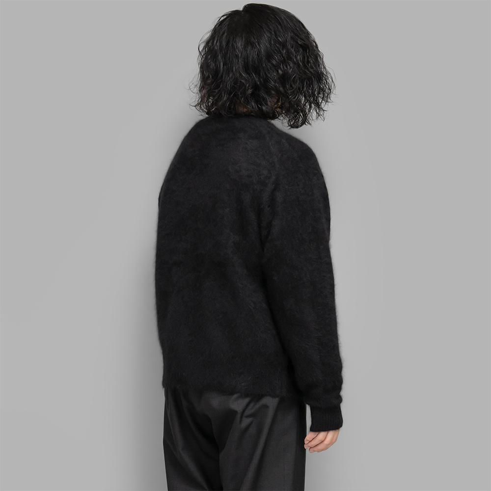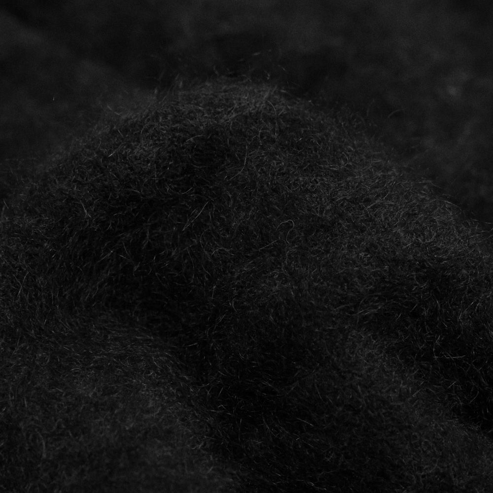 素材は、毛足の間に空気を含むことにより暖かく、滑らかな肌触りと圧倒的な軽い着心地が特徴の、ラクーン素材を使用しています。編地は緩く編み上げ、仕上げに加工を施すことで膨らみをもたせています。