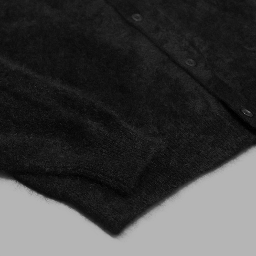 型は、身幅やアームホールには程よくゆとりを持たせ、着丈はすっきりとさせることで、メリハリのあるサイズバランスで製作されたカーディガンです。裾のリブは締め付けが強くなく、縦にストンと落ちるシルエットも特徴です。