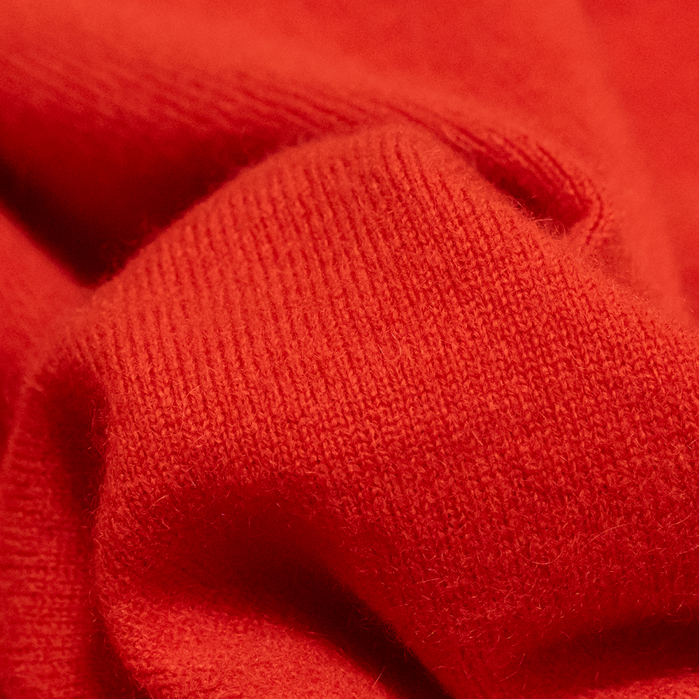 素材は、厳選された高品質のカシミヤ原料を丁寧に紡いで製作された高級カシミヤ糸を使用しております。緩めに編んで加工を施すことにより、原料の良さが際立ち、程よく厚みがありながらも、やわらかい着心地とふくらみを実現しています。