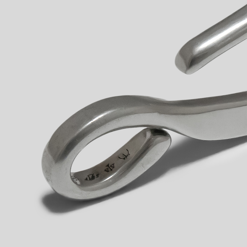 シルバー素材で作製したカラビナです。キーホルダーとして、ベルトループなどに付けてご利用いただけます。部分的に角を落としたり幅を変えながら、形どられています。