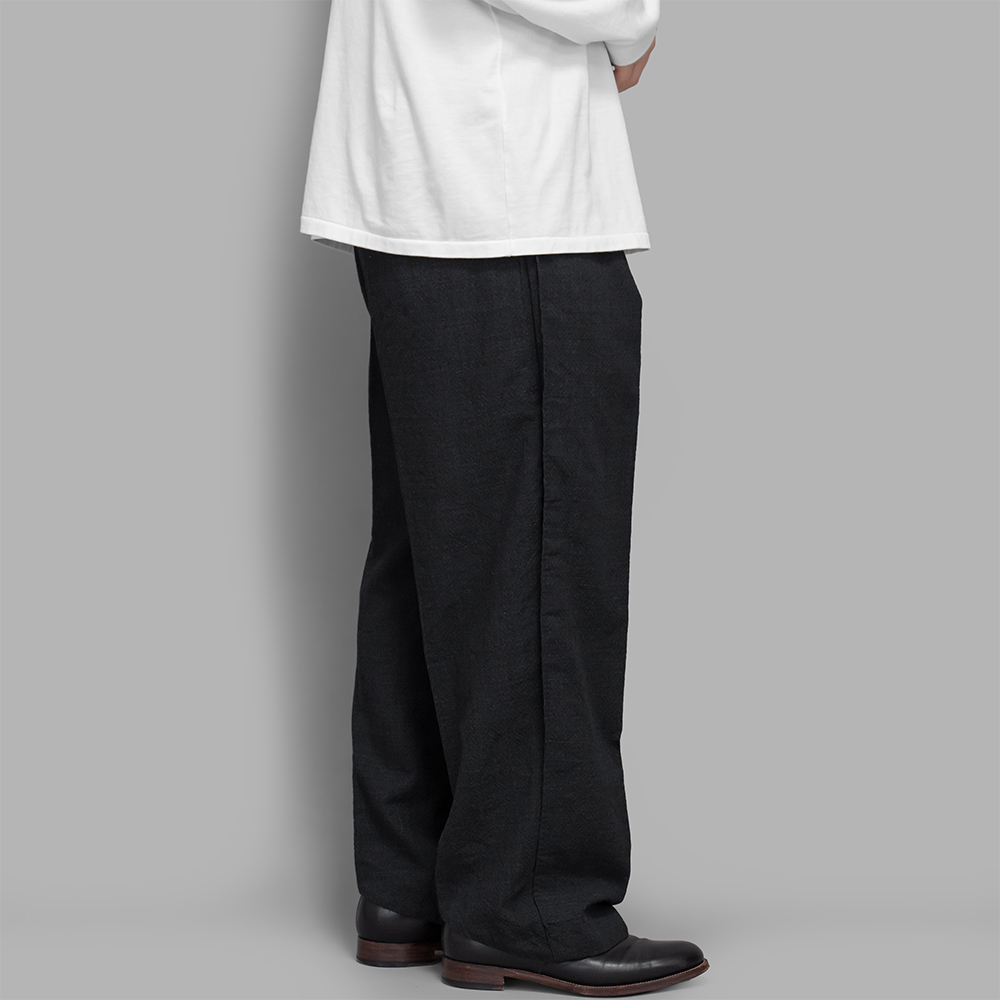 裾を引きずる事なく、足元のクッションでボリュームを持たせられることで、今までのワイドストレートシルエットとは違う合わせや雰囲気を楽しめる1着です。また、生地の凹凸により肌離れも良く、気温や湿度の高い時期にも着用しやすいのも特徴の一つです。