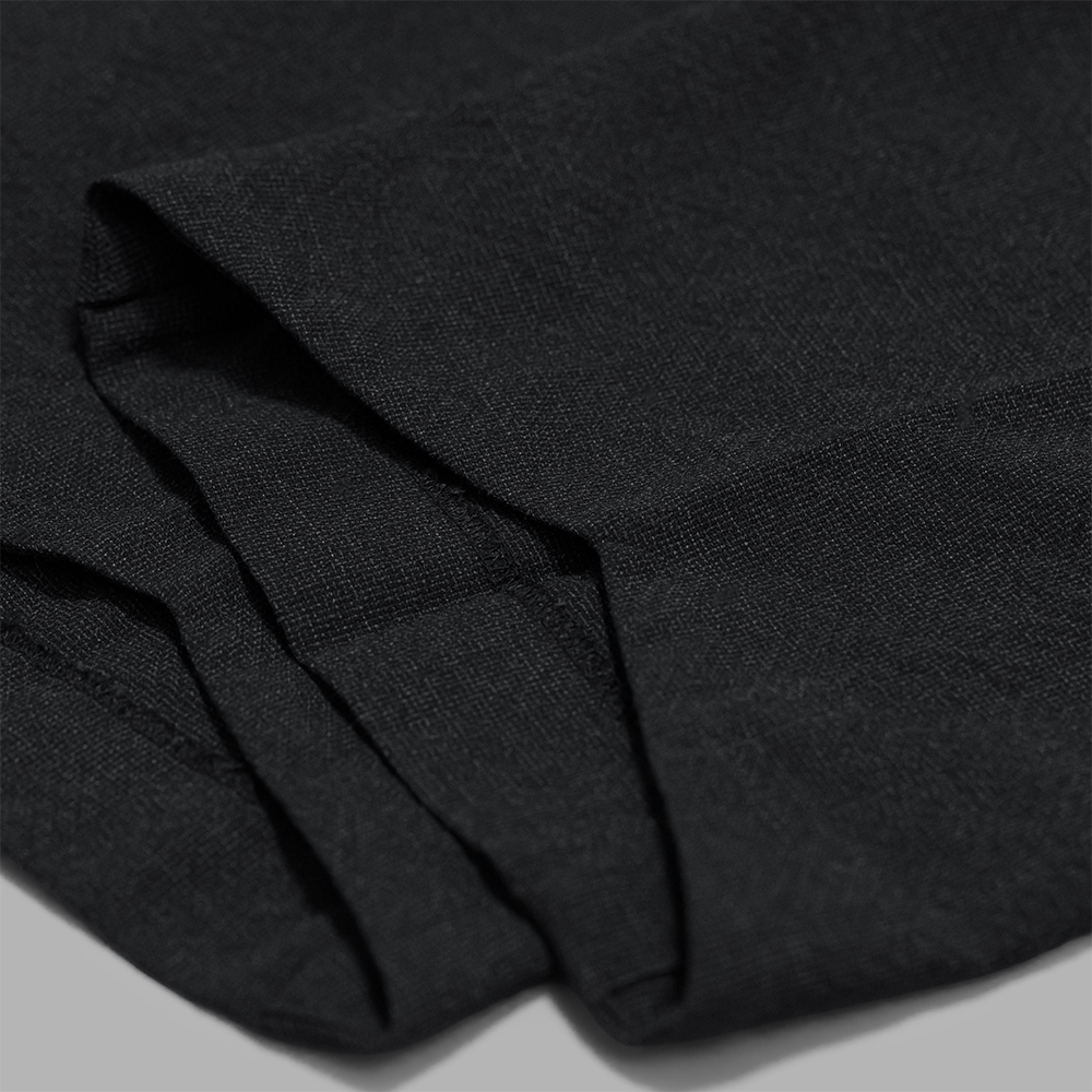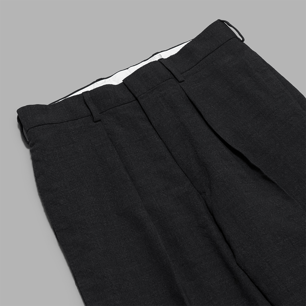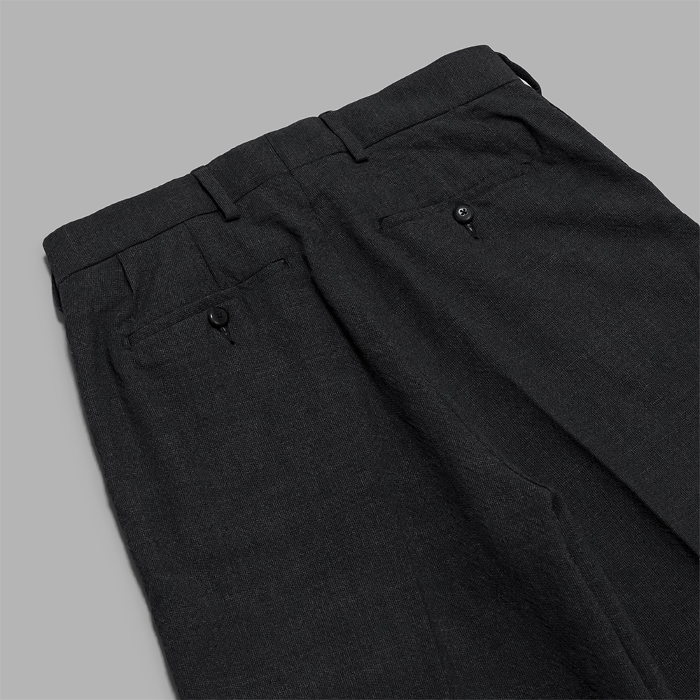 素材は、3種の細番手メリノウールを、ブランドオリジナルで紡績したZ撚り平織りのヘリンボーン生地を使用しています。薄手にはなりますが、特徴的な撚りを施すことで、生地に凹凸が生まれ程よくハリのある生地感となっています。黒色以外はTOP糸の使用により、深みのある色合いとナチュラルなムラ感が奥ゆかしさを漂わせます。