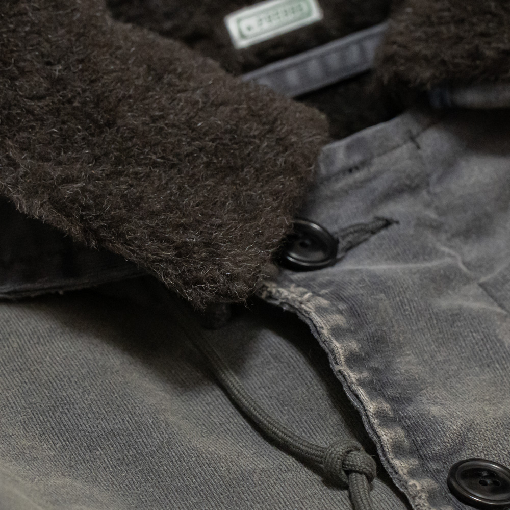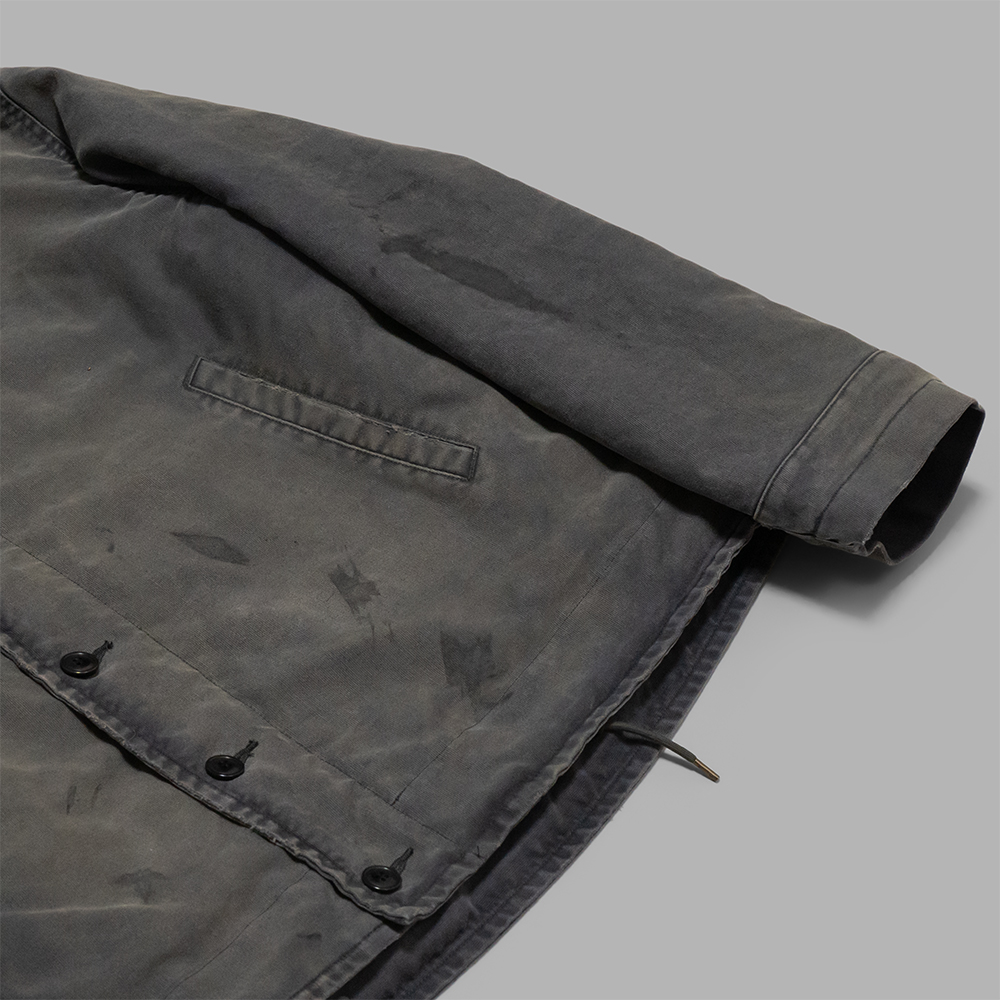 加工は、過酷な環境下で使用されるデッキジャケットの経年変化を手作業で忠実に再現しています。フェードした色合いやリアルなダメージ加工が大変雰囲気があり、シンプルにあわせるだけで、コーディネートが完成するような1着です。また、スッキリした丈感とゆとりをもたせ身幅によるボックスシルエットは、ボトムスの太さを選ばず、様々な着こなしをお楽しみいただけます。