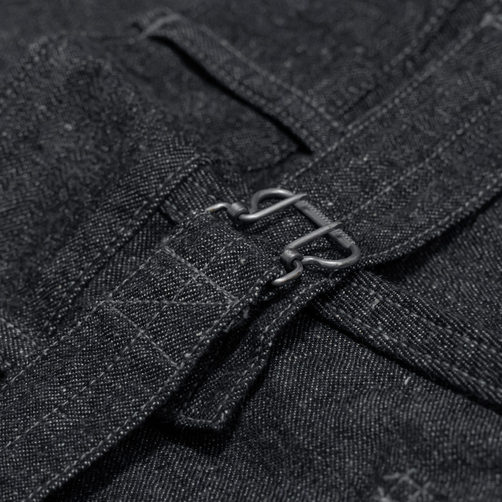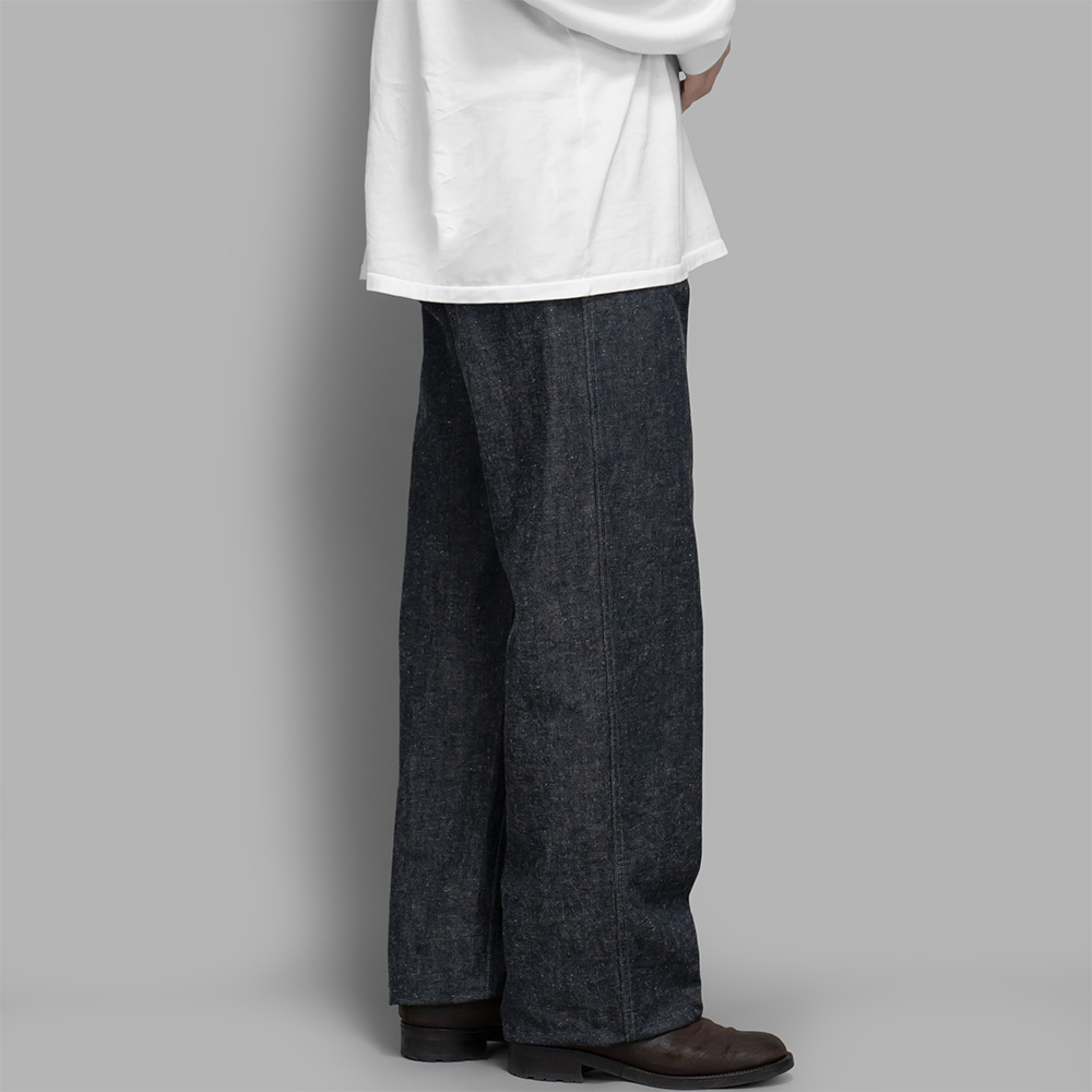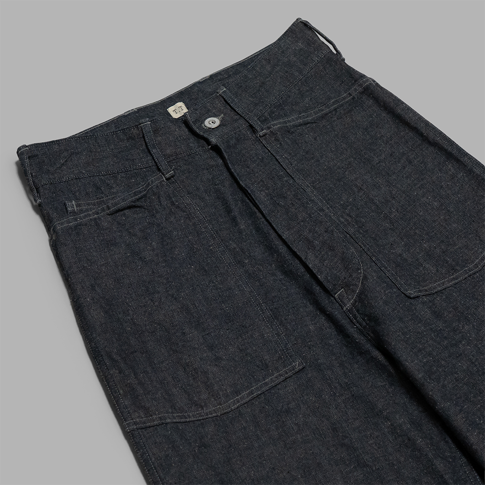 型はフロントとバックに配された大きなパッチポケットが特徴的である、M35デニムをベースにデザインされています。当時支給されていたサイズ感はかなり大まかであったため、ウエストはシンチバック仕様で、ステッチには白糸が多く使用されていたが、グレーの例も確認されており、こちらにもそれを反映させています。前立てはボタンフライです。