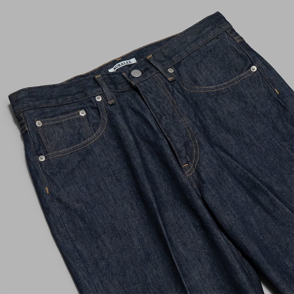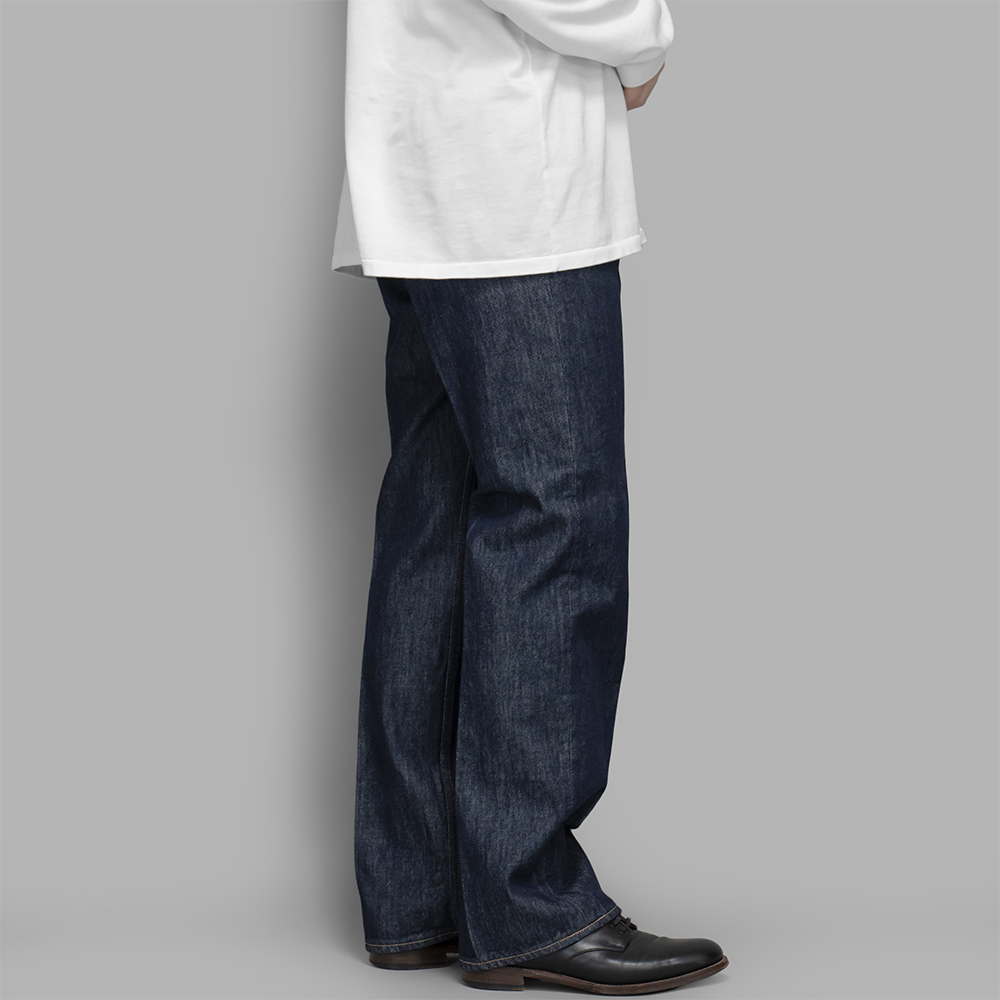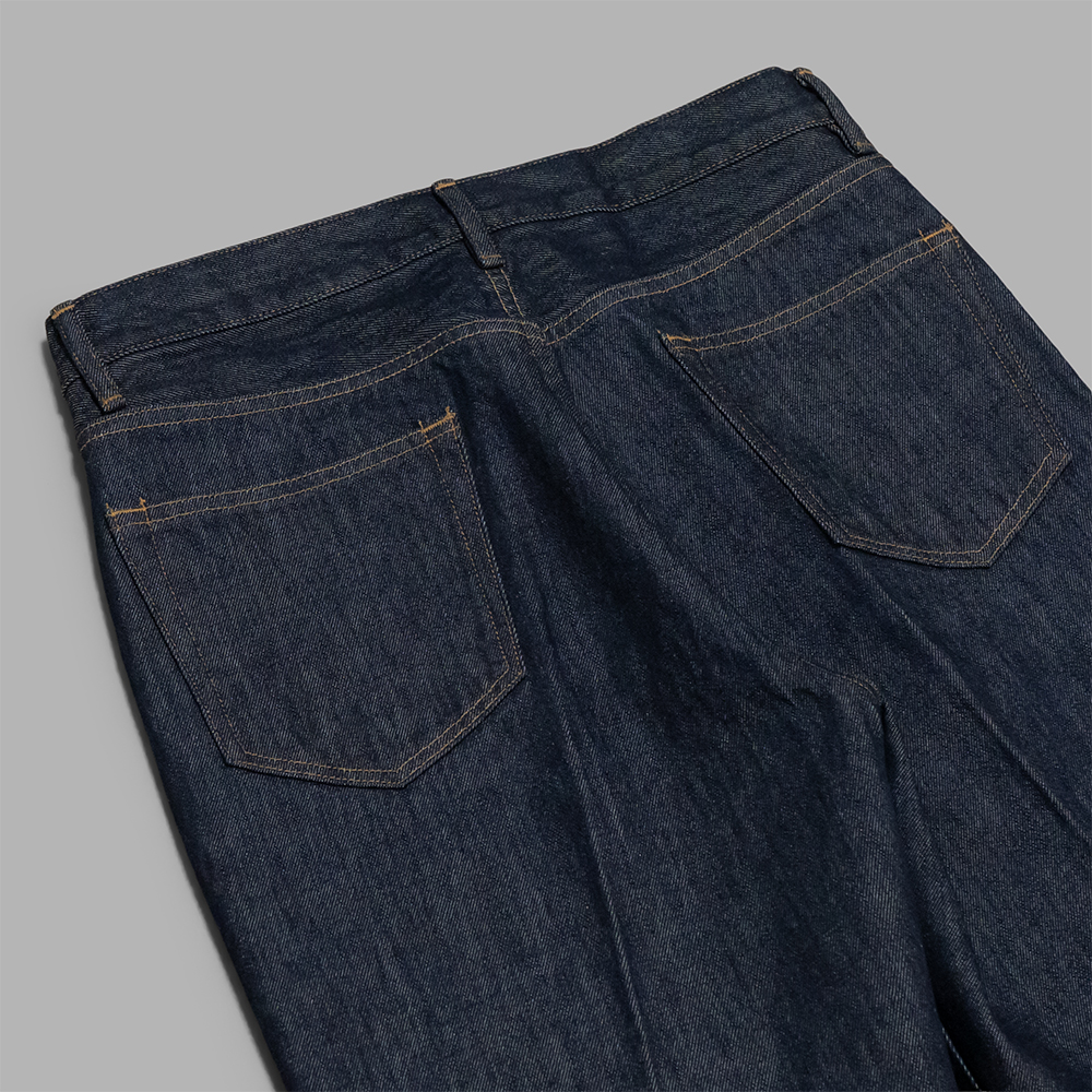 素材は、何度洗い込んでも生デニムのようなパリッとした風合いを保てるデニムを目指し、一から開発したブランドオリジナルの生地を使用しています。縦糸には、ピュアインディゴでロープ染めしたムラ糸を極限まで強撚し使用しており、シャリ感のあるドライな質感と、自然な弾力のあるナチュラルストレッチを備えた、他にはない独自の風合いが特徴です。