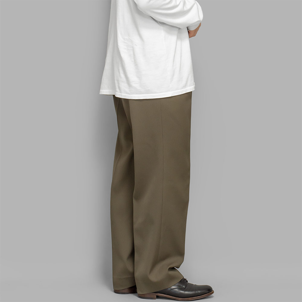 万能な着こなしを楽しめるカジュアルスラックスの代名詞といえるワイドテーパード型のスラックスです。薄手の生地ではありませんが、表面はサラッとしていて、起毛感もないため、シーズンにそこまで左右されずに着用できることも魅力の1つです。