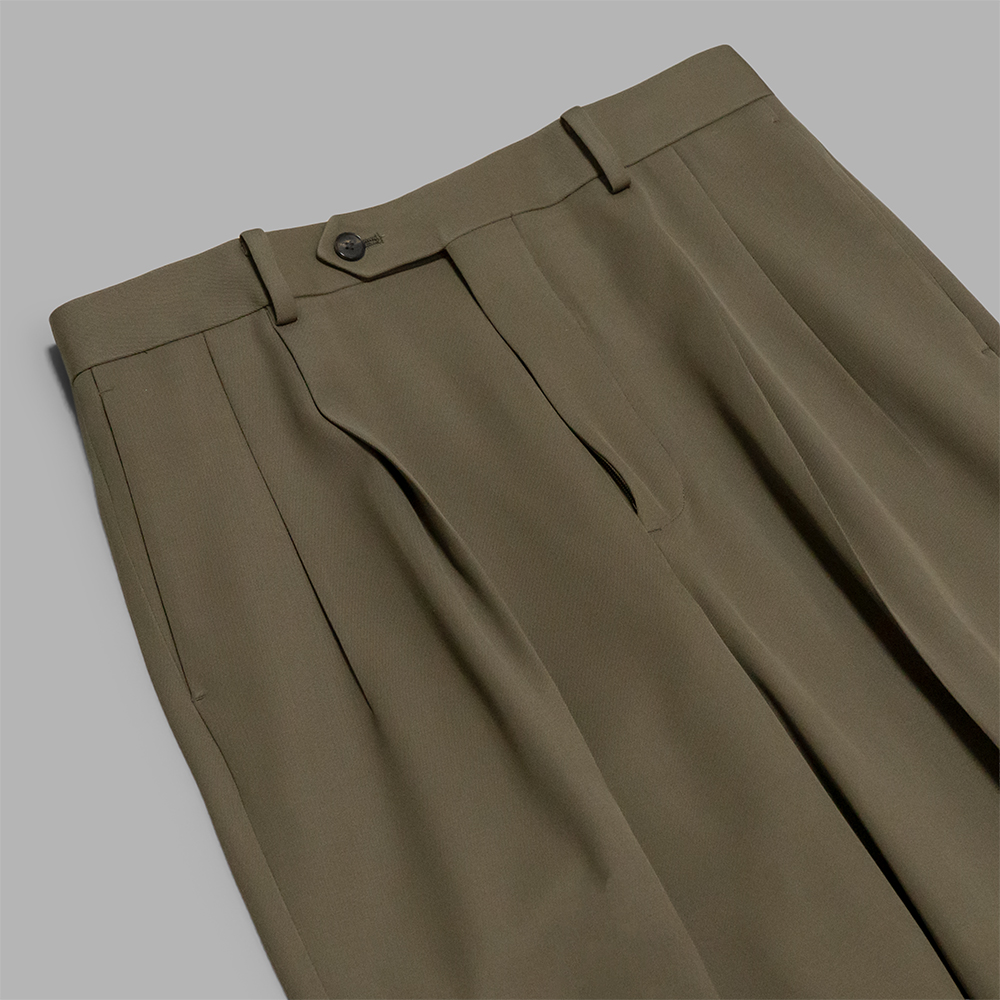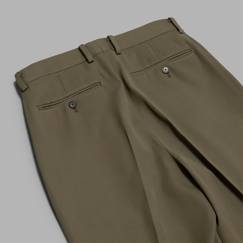 型はツータックのトラウザーで、腰回りにゆとりをもたせて、膝下から緩やかにテーパードをかけています。前立てはジップフライ、腰裏はマーベルト、ヒップポケットは両玉縁で丁寧に仕立てています。中は半裏の仕様です。