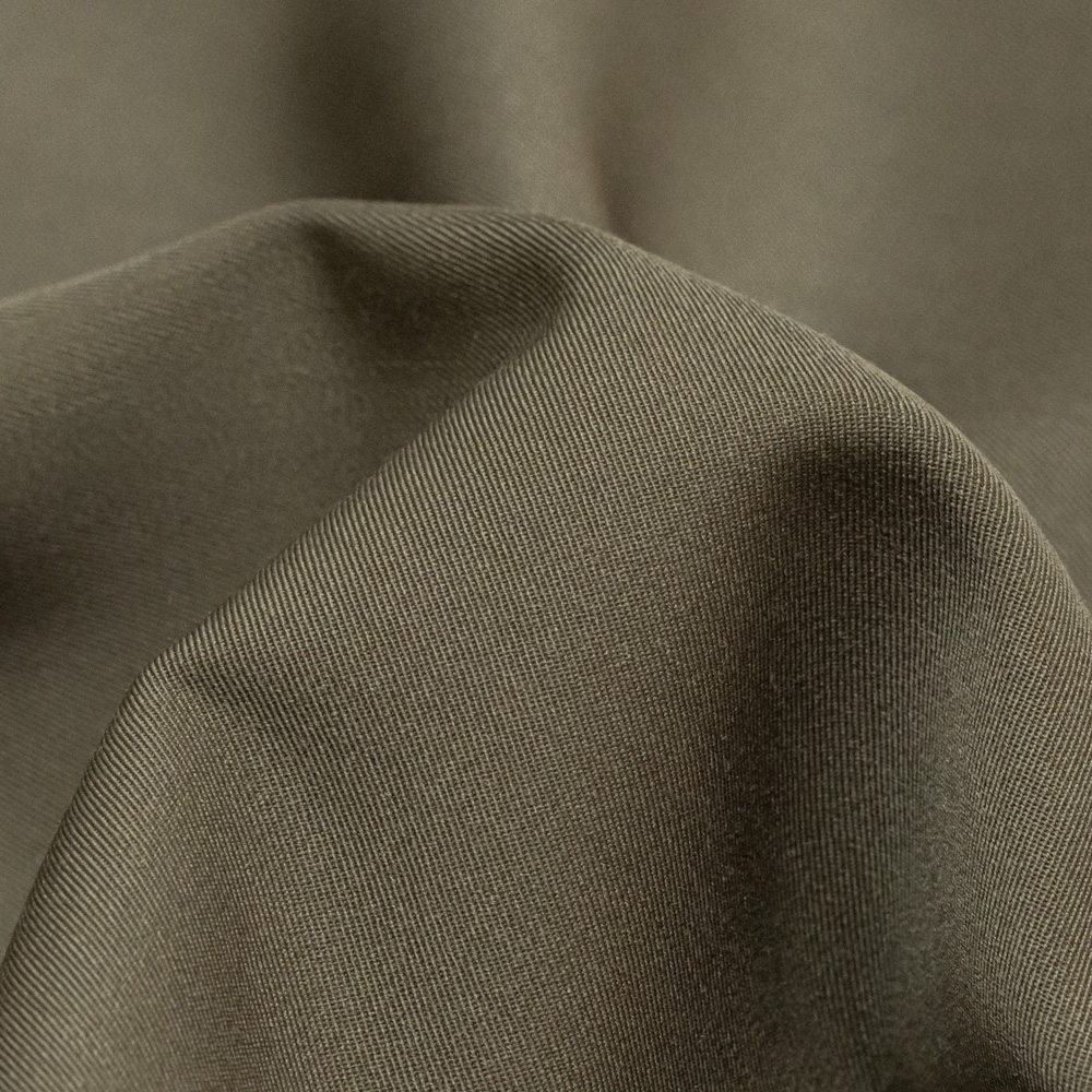 上質な極細繊維のスーパー140’Sウールを使用し、限界まで高密度に織り上げたウールギャバジンです。仕上げにウールの伸縮性を活かしてハリコシを最も強く出す加工と撥水加工を施しています。それにより、シワになりにくく、独特な落ち感と程よい綺麗な光沢のある生地に仕上がっています。