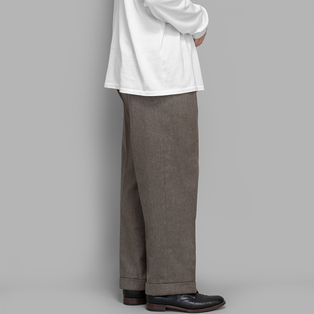 落ち着いた色味でリラックス感のあるセミワイドシルエットは汎用性が高く着回しの利く1着です。上質な素材同士の合わせは勿論、ラフにスウェットやパーカーなどとの合わせも上品さを醸し出してくれます。