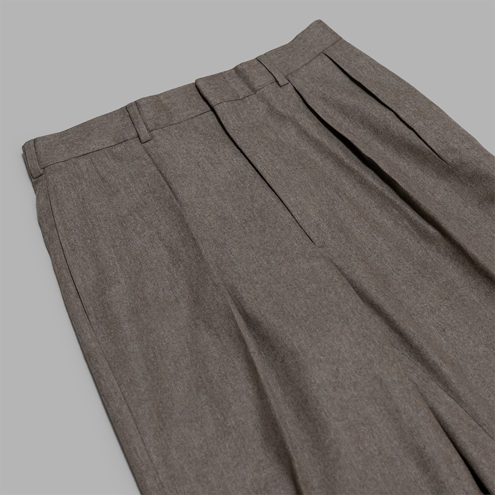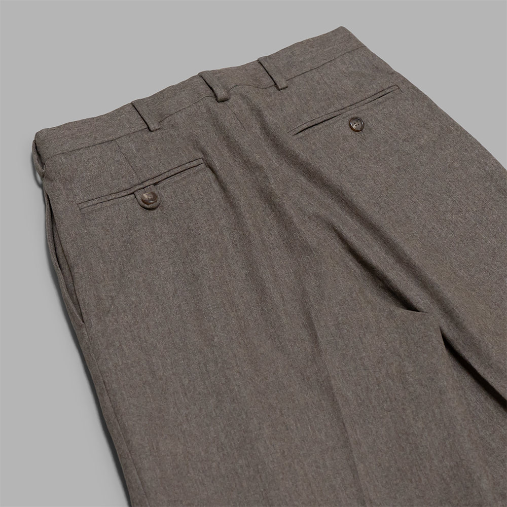 特徴的な前面のディテールは腰周りのゆとりと運動量を確保する2インプリーツの仕様に、コインポケットが採用されています。バックポケットには両玉縁のポケットに同素材と相性の良いボタンが採用されており、抜かりのない仕上がりとなっています。