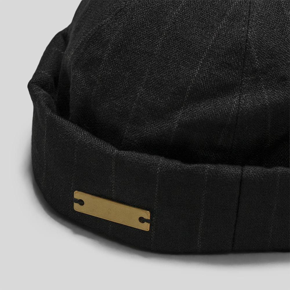 真鍮のプレートには、サイズの数字とKLASICAのネームが手作業にて打ち込まれています。ツバの付かないフィッシャーマンキャップは、ニット帽のような感覚で合わせられるので使い勝手の良いアイテムです。