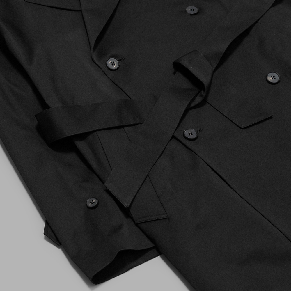 型は、トレンチコートのような大ぶりな襟が特徴的で、程よくリラックス感のあるサイズバランスで製作されたダブルブレステッドコートです。襟は立ててボタンで留めて着用することができ、中は裏地のない一重の仕様で内ポケット付きません。ウエストには同素材のベルトが付属します。