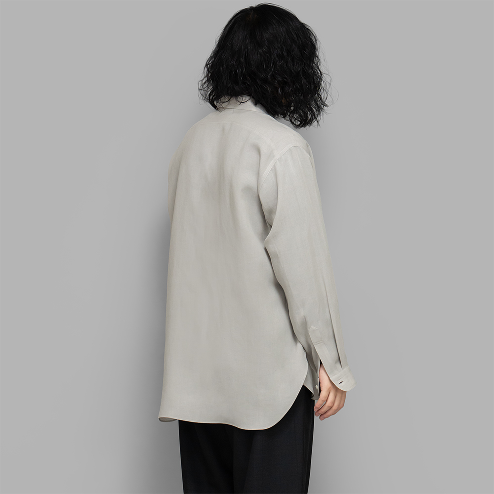 ブランドで定番として展開しているシャツ型に、前見頃にポケットを配置し、よりデイリーな仕様に変更したレギュラーカラーシャツです。構造は、アクションプリーツ・ヨークのないシンプルな後ろ身頃ながら、アームホールのカービングをきつくすることにより、十分な可動域を確保しています。サイズ感も適度にゆとりをもたせています。