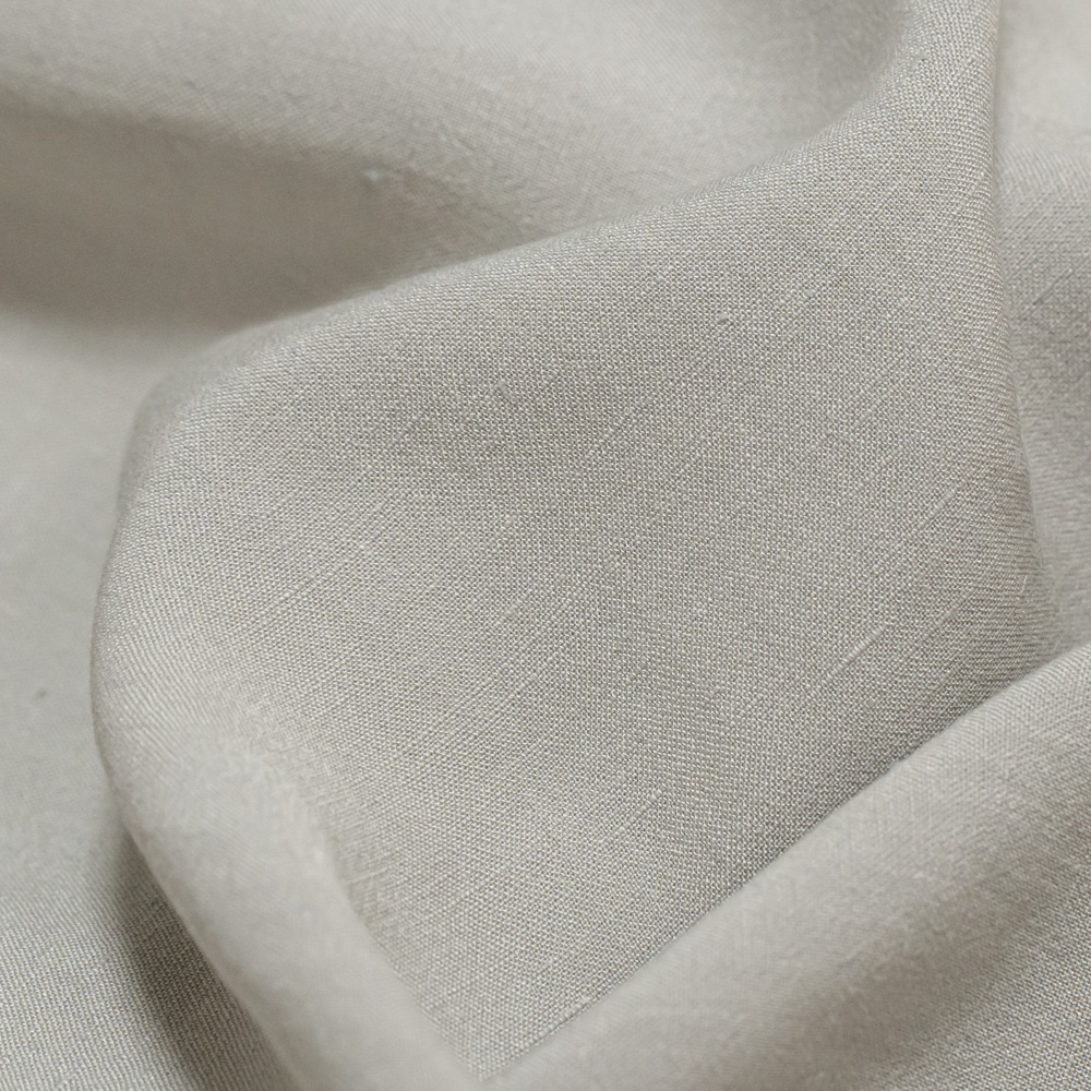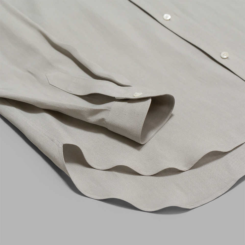 強撚のリネン素材で作製された比較的薄手でサラッとしたタッチの生地を使用しています。混率は、リネンだけではなく、レーヨンとポリエチレンも加えられているため、清涼感がありながらも、艶感のある上品な仕上がりになっています。