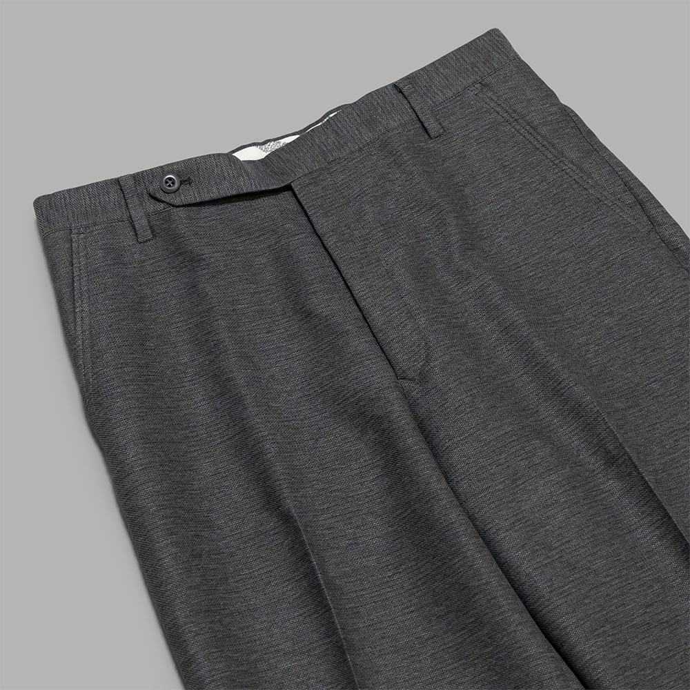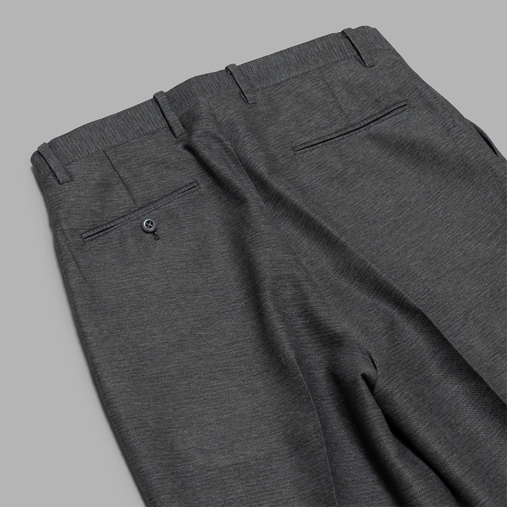 近年、開発したにも関わらず、定番と化した同モデルは、膝までストレートで膝下から緩やかに広がるシルエットが特徴的なフレアパンツです。腰回りはノータックでスッキリとさせて、センタークリースを施すことで、ドレスアイテムの印象を感じる作りにデザインしています。