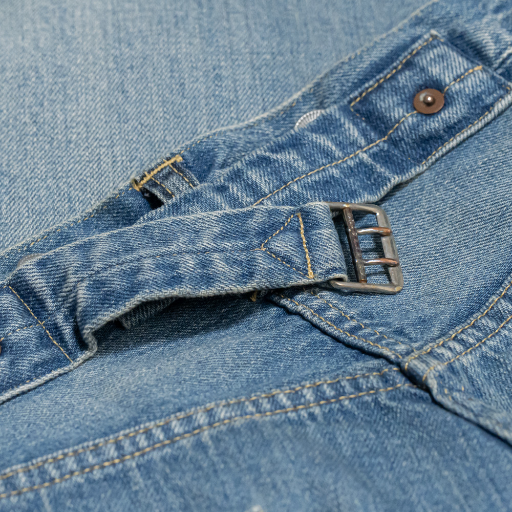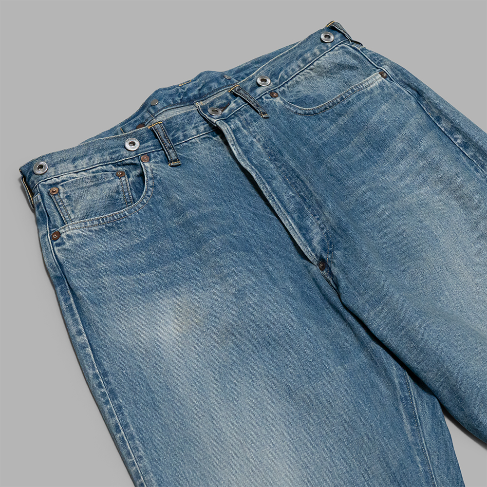 デザインは、1922年モデルの501XXをベースに、バランスを整えた太めのシルエットで作られています。上流階級だけではなく若い労働者階級にもベルトが普及した時代でもあり、この年から初めてベルトループが採用されています。それまでのシンチバックやサスペンダーボタンも残され、変換期ならではの多種多様なディティールを備えています。前立てはボタンフライの仕様です。
