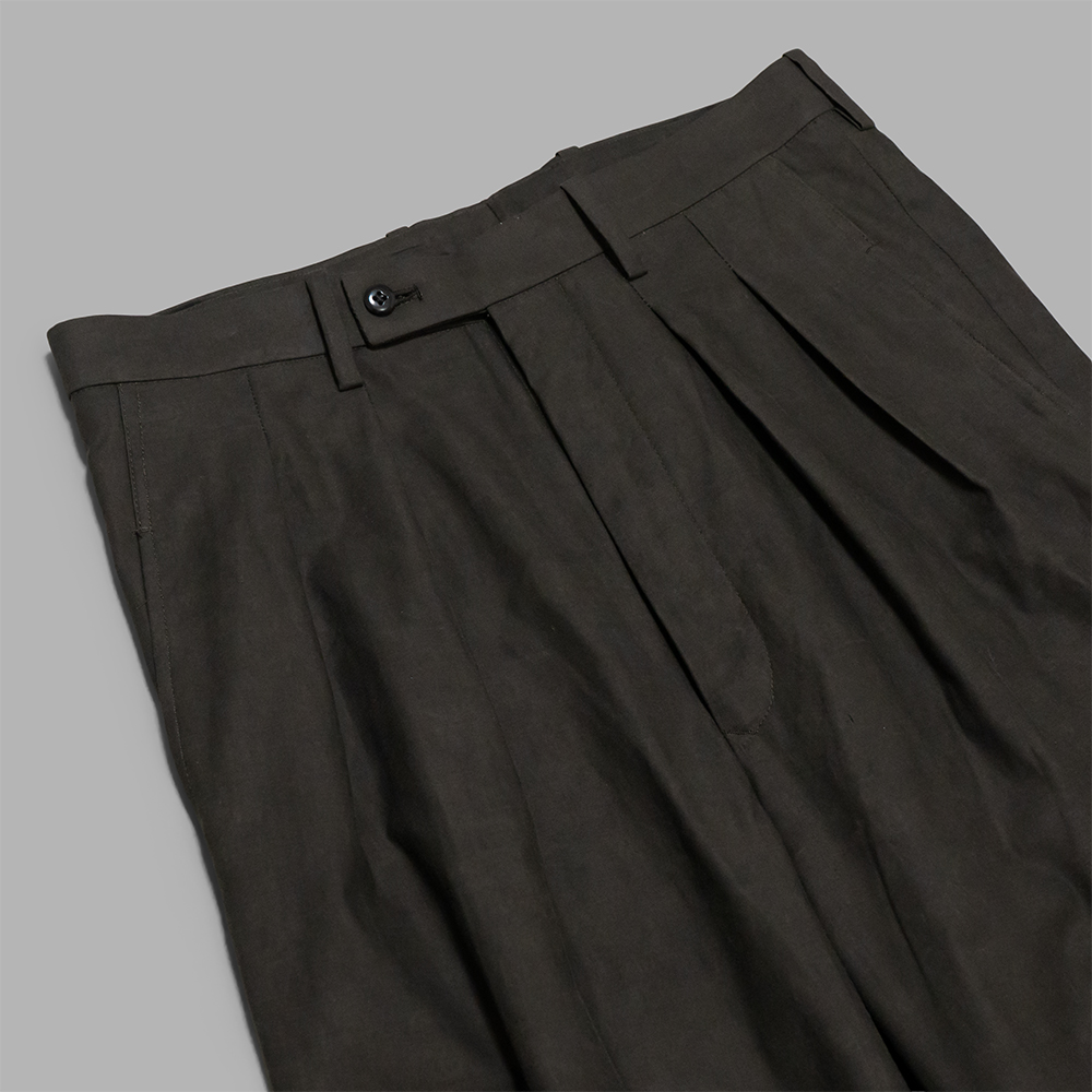 型は裾までストンと落ち感のある、ワイドシルエットです。インタックを2つ入れることで、わたりの太さに対してスッキリとしたウエストやシックなマーベルトなど、ドレスの印象を残しながらも、センタークリースを入れずにカジュアルさのあるパンツにデザインしています。
