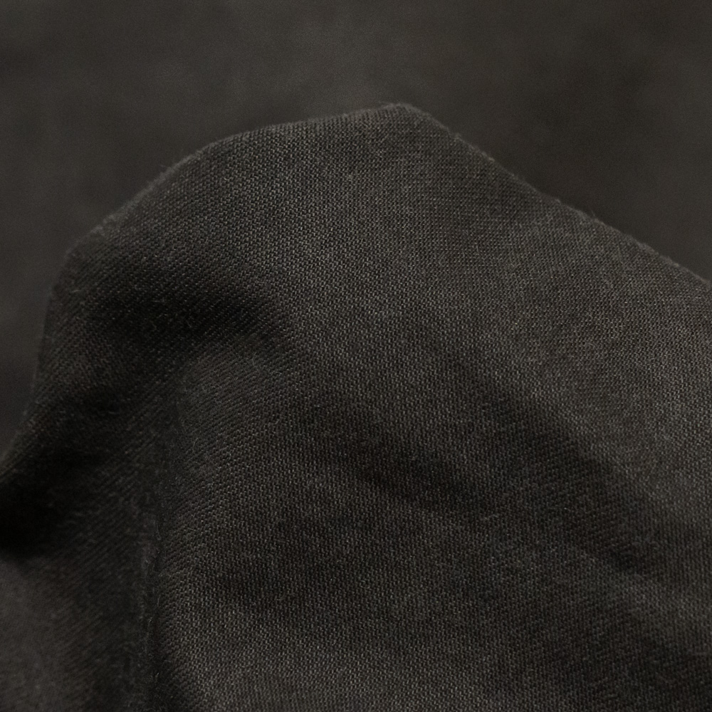 生地は、コットンを使用した薄手のバックサテンに、墨汁コーティングとワッシャー加工を施し、エイジングしたような風合いと奥行きのある色合いに仕上げた素材を使用しています。ライトウエイトな履き心地でありながらも、シャツやカットソーをシンプルにあわせるだけで、雰囲気のあるスタイルを作れる素材です。
